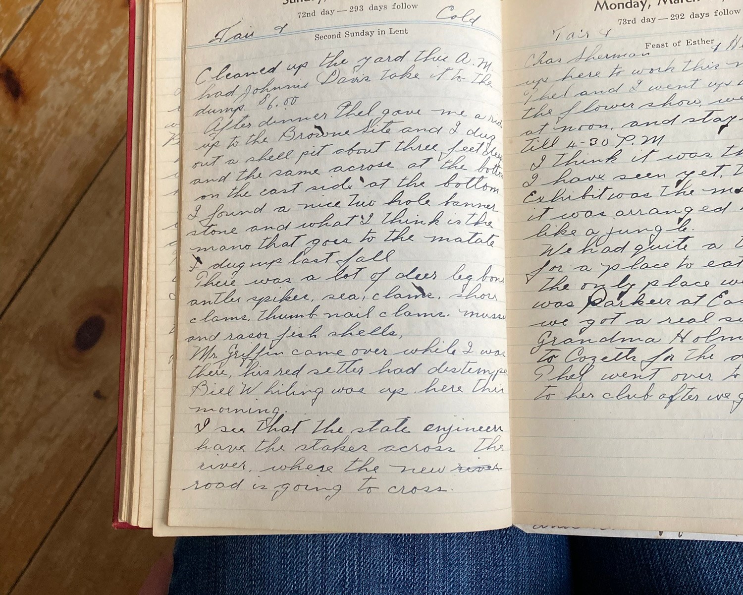 After dinner Thel gave me a ride up to the Browne site and I dug out a shell pit about three feet deep and the same across at the bottom on the east side. At the bottom I found a nice two hole banner stone and what I think is the mano that goes to the matate I dug up last fall.