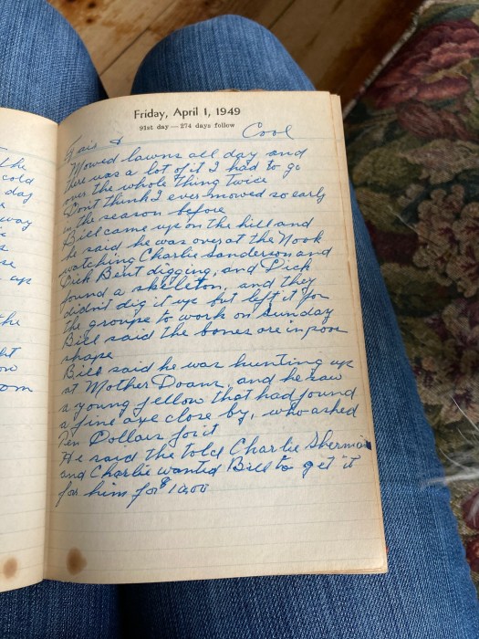 Bill came up on the hill and he said he was over at the Nook watching Charlie Sanderson and Dick Bent digging, and Dick found a skeleton, and they didn’t dig it up but left it for the group to work on Sunday. Bill said the bones are in poor shape.