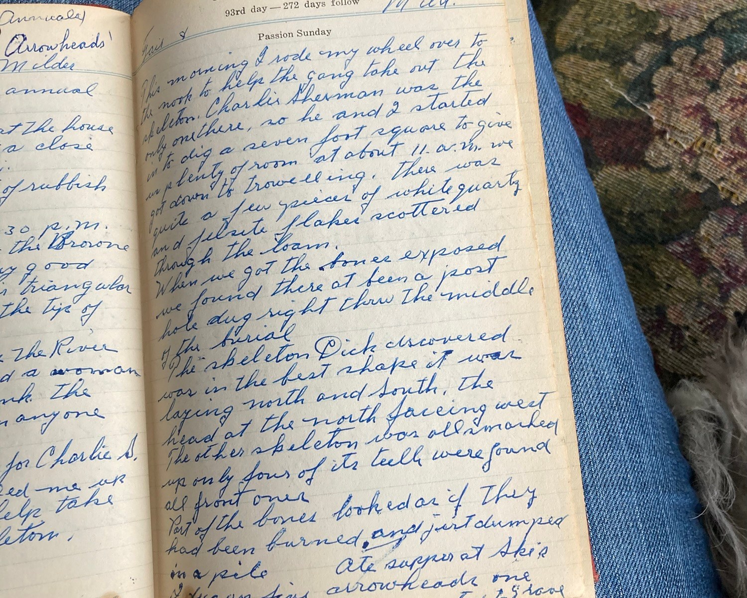 This morning I rode my wheel over to the Nook to help the gang take out the skeleton. Charlie Sherman was the only one there, so he and I started in to dig a seven foot square to give us plenty of room at about 11A.M. We got down to trowelling. There was quite a few pieces of white quartz and felsite flakes scattered through the loam.