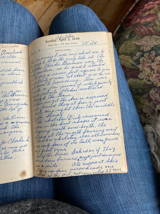 The skeleton Dick uncovered was in the best shape. It was laying north and south, the head at the north facing west. The other skeleton was all smashed up only four of its teeth were found, all front ones.