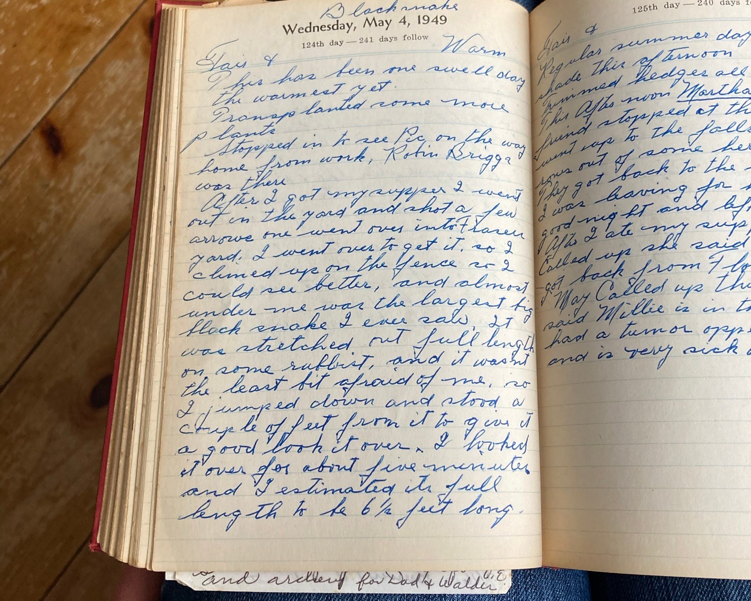 After I got my supper I went out in the yard and shot a few arrows. One went over into Fraser’s yard. I went over to get it, so I climbed up on the fence so I could see better, and almost under me was the largest big black snake I ever saw. It was stretched out full length on some rubbish and it wasn’t the least bit afraid of me, so I jumped down and stood a couple of feet from it to give it a good look over. I looked it over for about five minutes and I estimated its full length to be 6 ½ feet long.