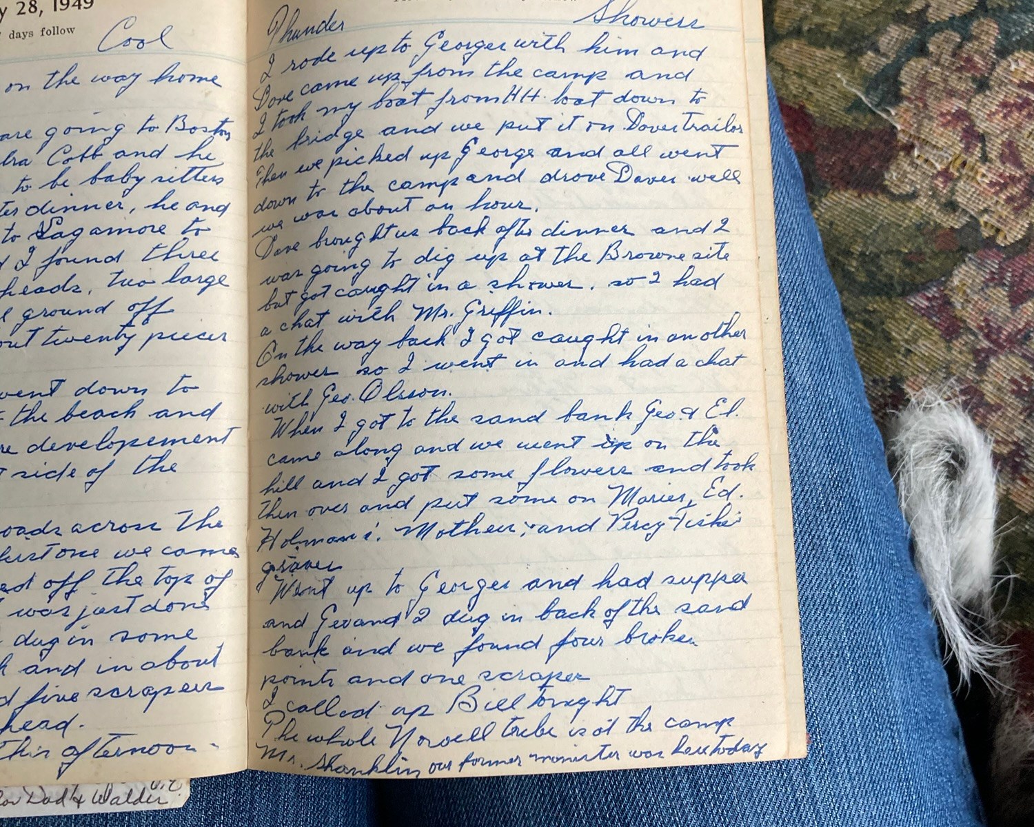 Went up to George’s and had supper and Geo. and I dug in back of the sand bank and we found four broken points and one scraper.