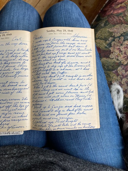 I rode up to George’s with him and Dave came up from the camp and I took my boat from H.H. boat[house] down to the bridge and we put it on Dave’s trailer. Then we picked up George and all went down to the camp and drove Dave’s well. We were [there] about an hour.