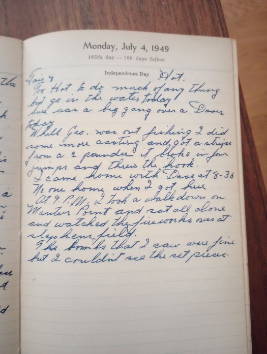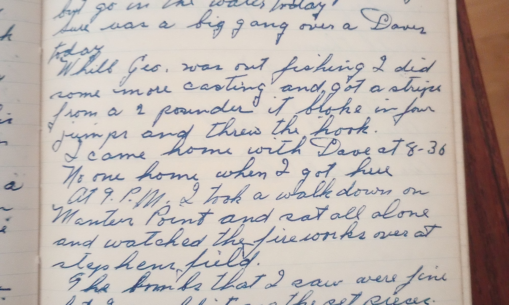 At 9 P.M. I took a walk down on Manter’s Point and sat all alone and watched the fireworks over at Stephen’s Field.