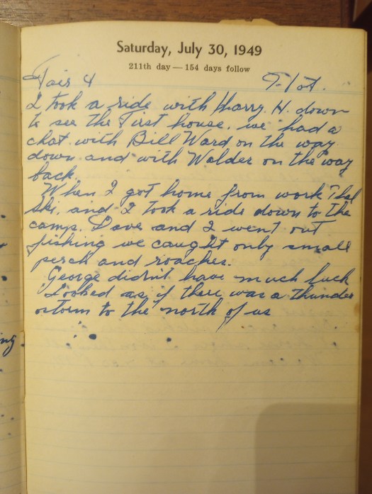 When I got home from work, Thel, Ski, and I took a ride down to the camp. Dave and I went out fishing. We caught only small perch and roaches.