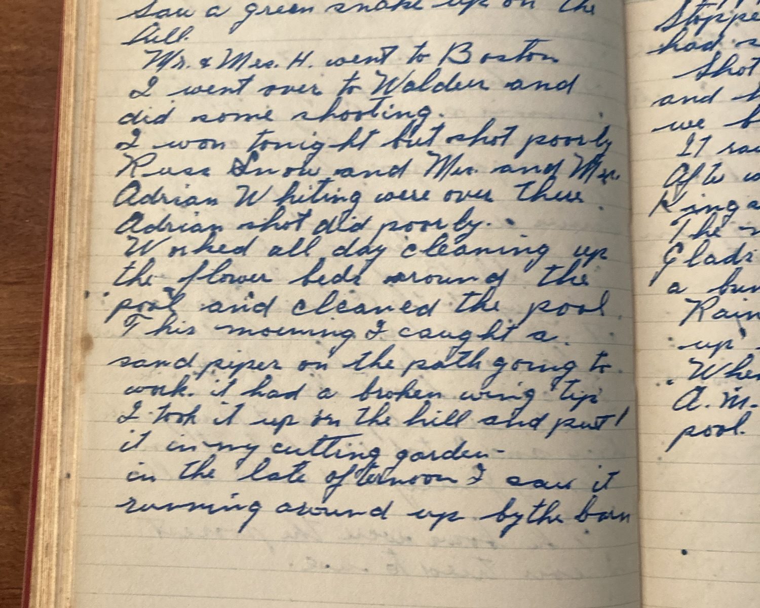 Mr. + Mrs. H. went to Boston. I went over to Walder’s and did some shooting. I won tonight but shot poorly. Russ Snow and Mr. and Mrs. Adrian Whiting were over there. Adrian shot poorly.