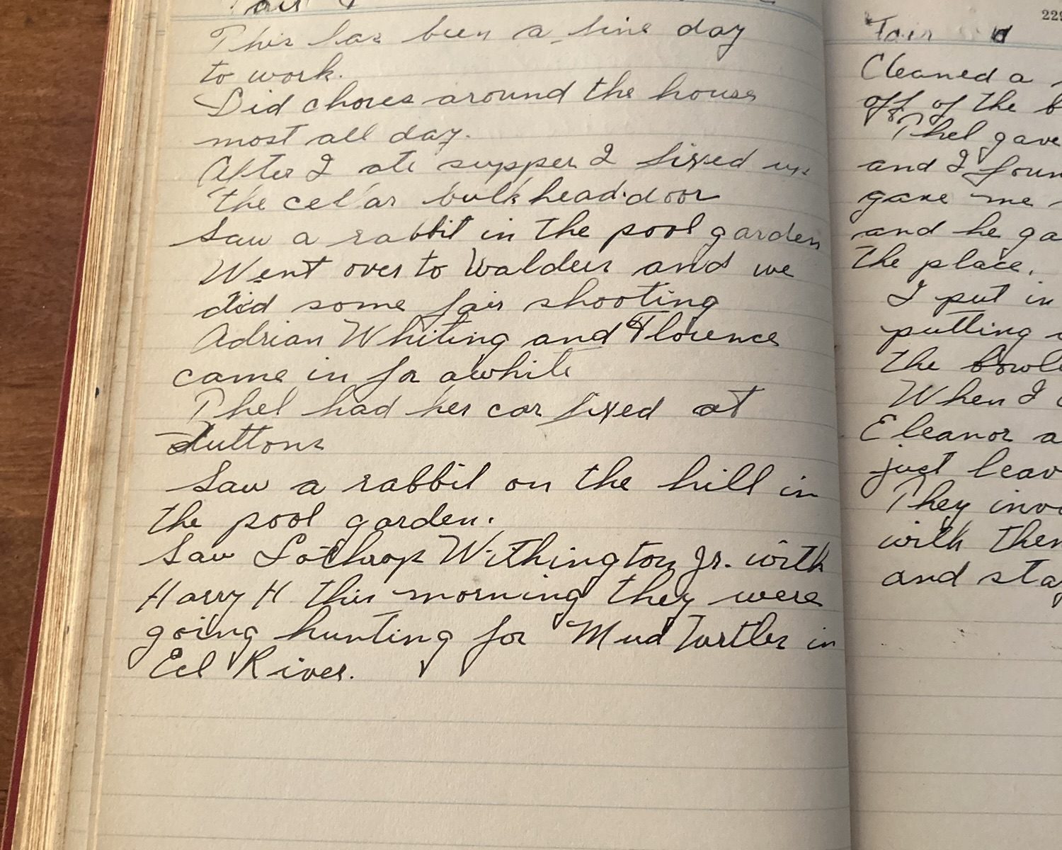 Saw Lothrop Withington Jr. with Harry H. this morning. They were going hunting for mud turtles in Eel River.
