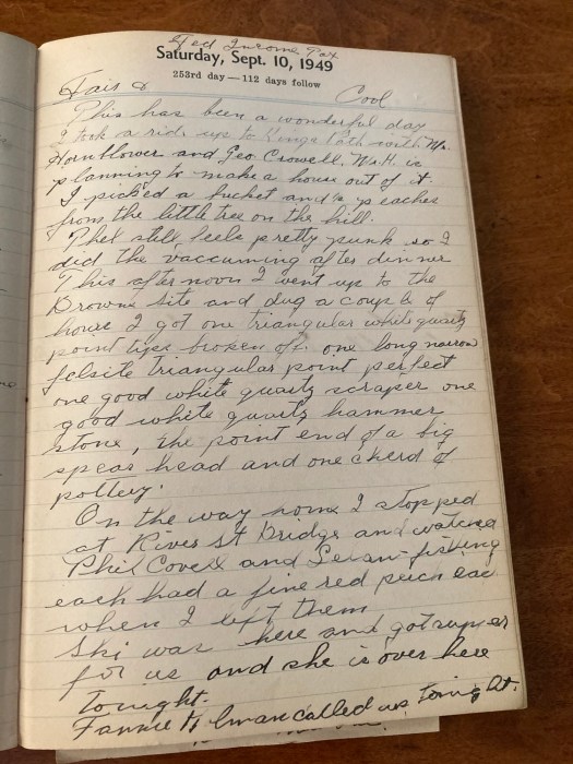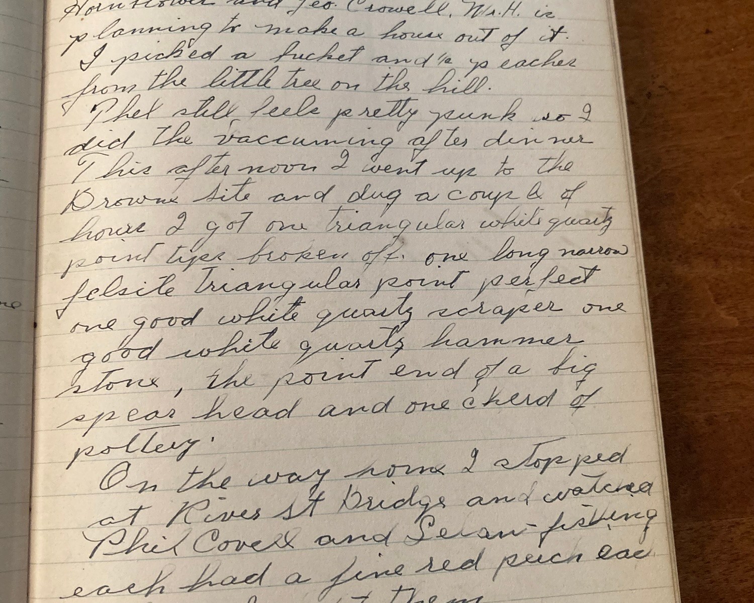 This afternoon I went up to the Browne site and dug a couple of hours. I got one triangular white quartz point tip broken off, one long narrow felsite triangular point perfect, one good white quartz scraper, one good white quartz hammer stone, the point end of a big spear head and one shard of pottery.