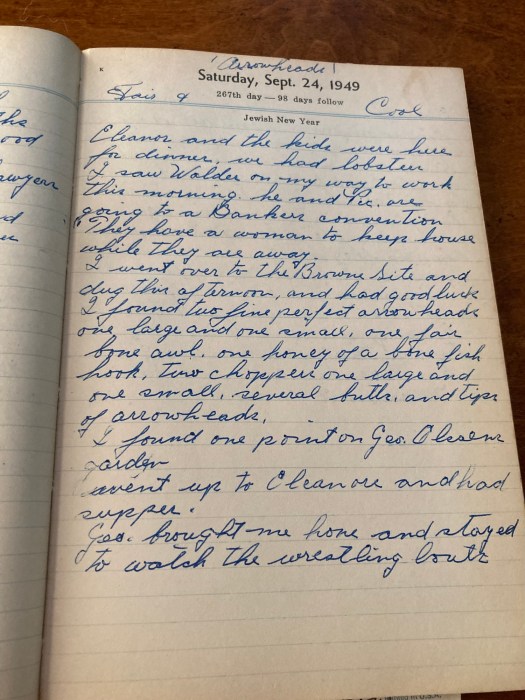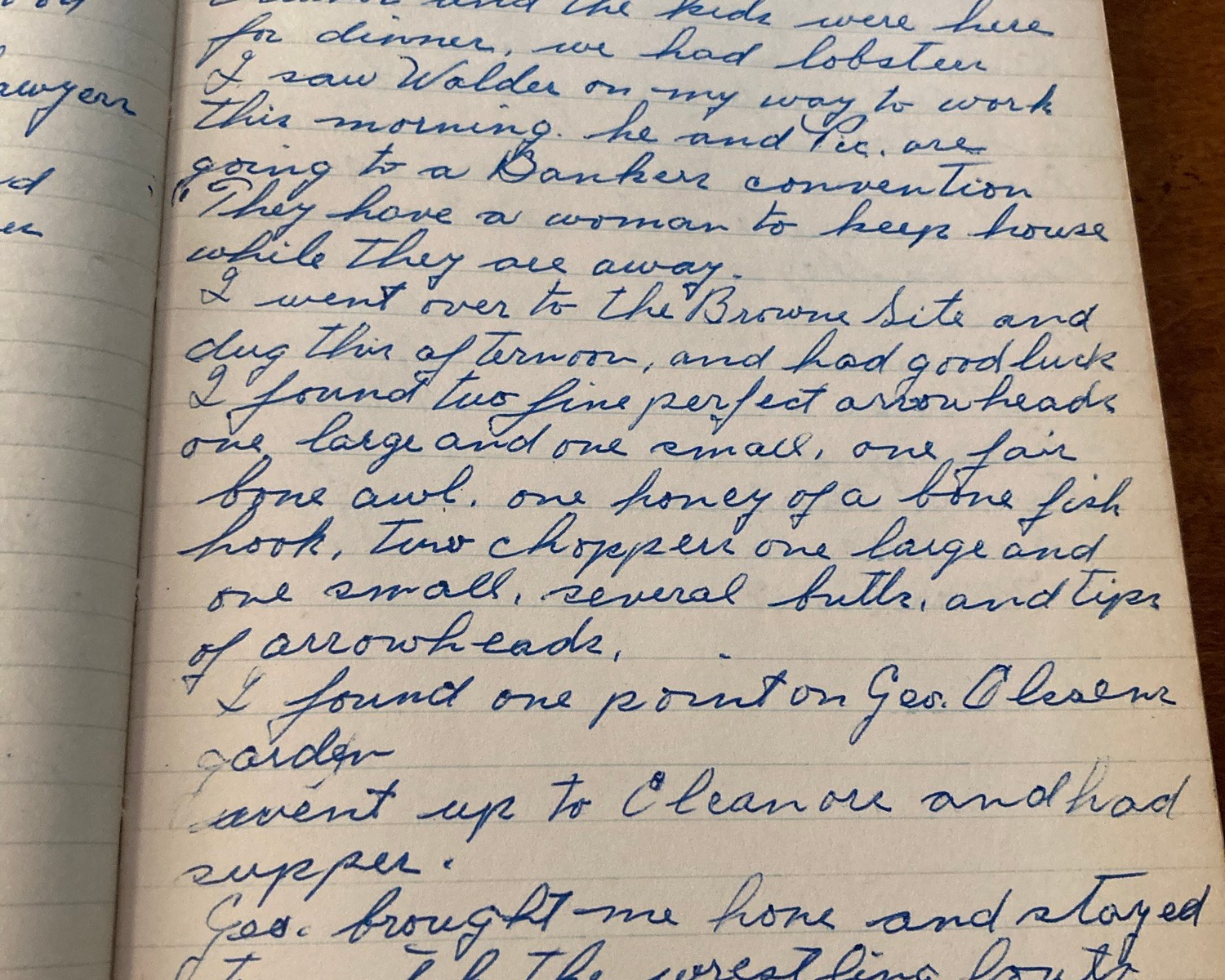 I found two fine perfect arrowheads, one large and one small, one fair bone awl, one honey of a bone fish hook, two choppers, one large and one small, several butts and tips of arrowheads.