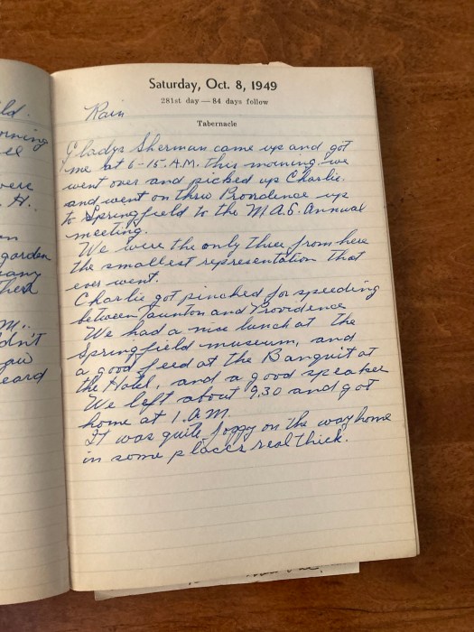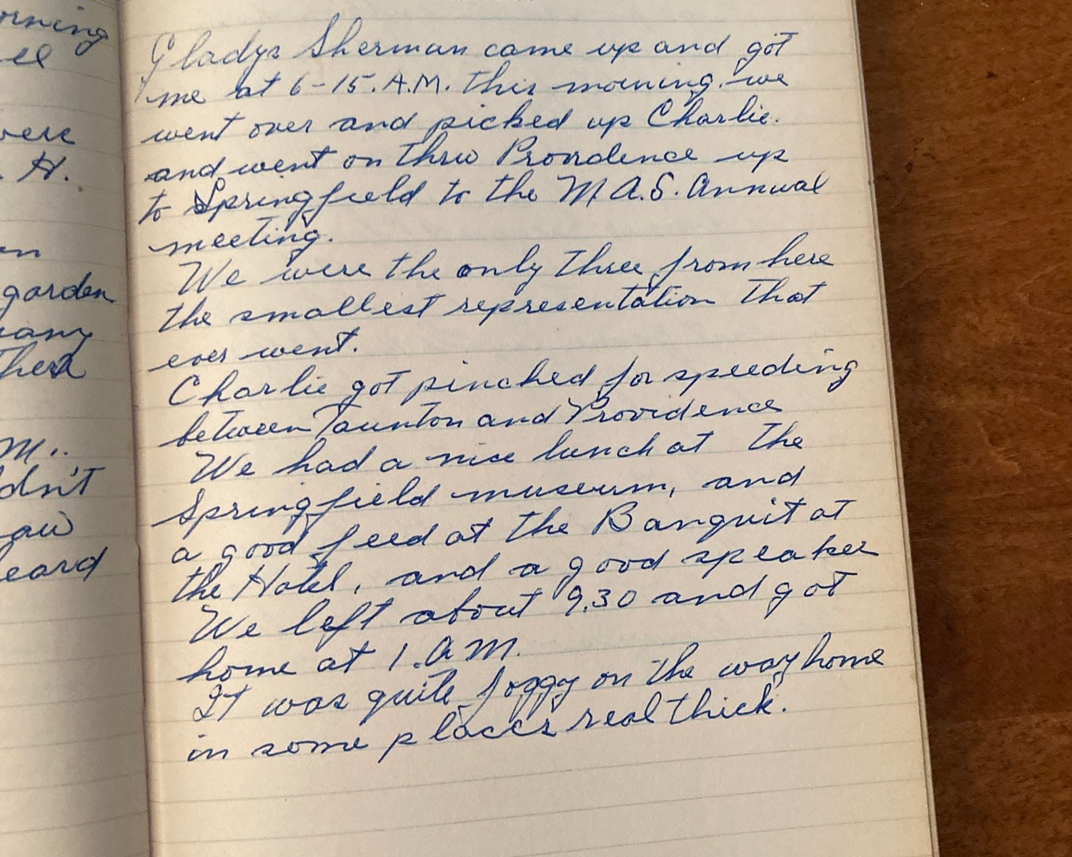 Gladys Sherman came up and got me at 6:15 A.M. this morning. We went over and picked up Charlie and went on thru Providence up to Springfield to the M.A.S. Annual meeting.