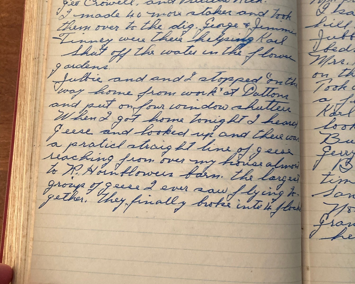When I got home tonight I heard geese and looked up and there was a practically straight line of geese reaching from over my house almost to R. Hornblowerās barn. The largest group of geese I ever saw flying together. They finally broke into flocks.
