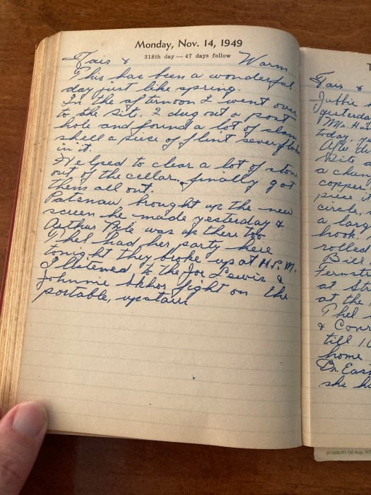 In the afternoon I went over to the site. I dug out a post hole and found a lot of clam shell, a piece of flint, several flakes in it.