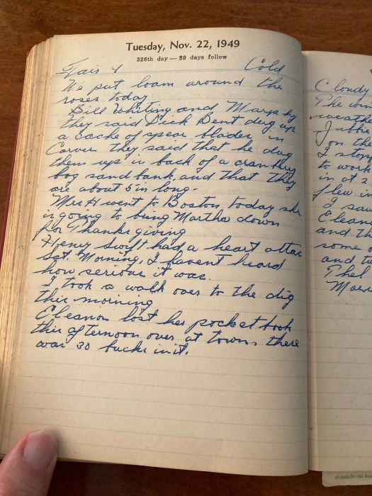 Bill Whiting and Marp [dropped] by. They said Dick Bent dug up a cache of spear blades in Carver. They said that he dug them up in back of a cranberry bog sand bank and that they are about 5 in long.