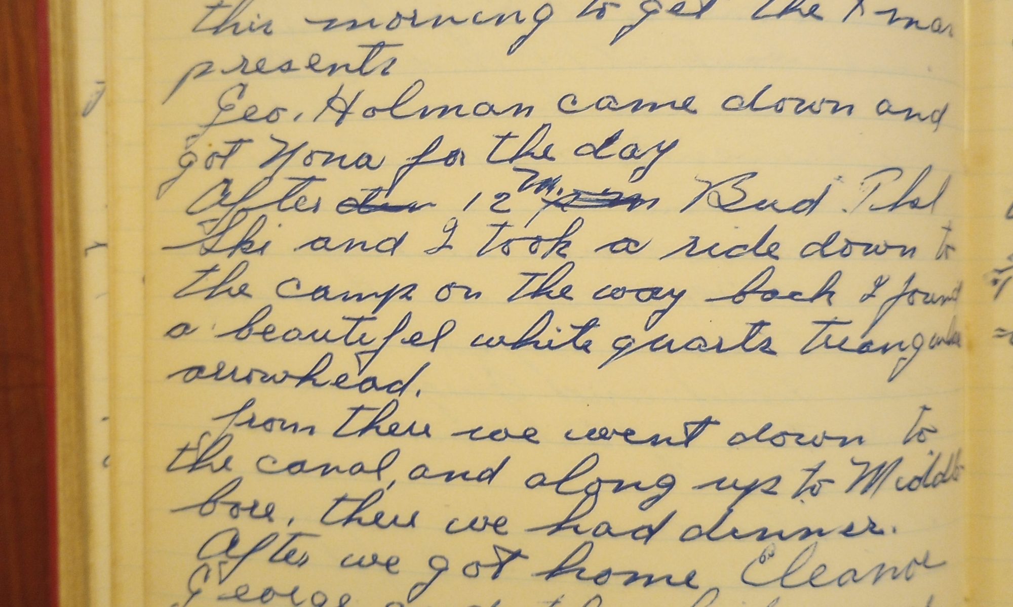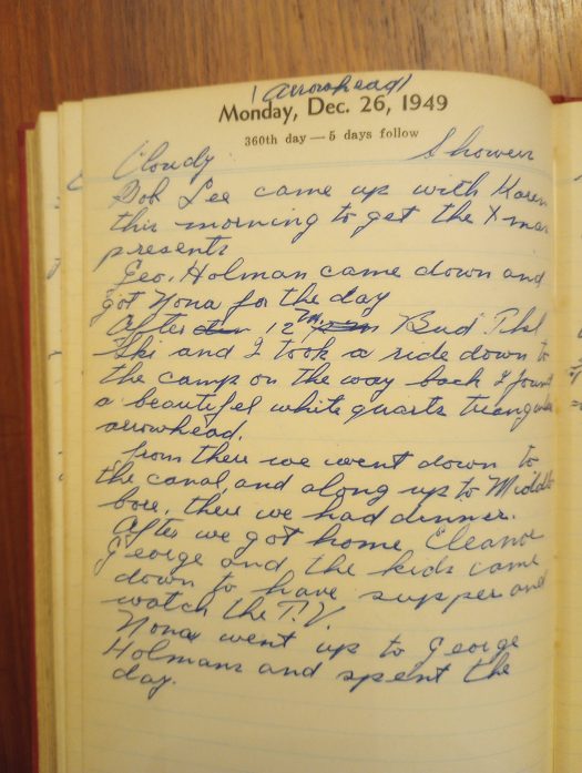 After 12PM Bud, Thel, Ski, and I took a ride down to the camp. On the way back I found a beautiful white quartz triangular arrowhead.