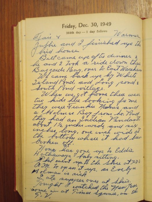 When we got home there were two kids here looking for me. They were Frankie Nunes and a Holmes boy from So.Pond. They had an Indian pendant about 1 ½ inches wide and six inches long, one inch wide at the bottom where it had been broken off.