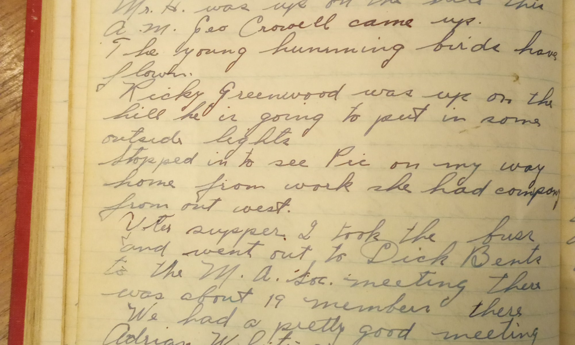 208th day- 157 days follow Fair and cooler. Mr. H. was up on the hill this A.M. Geo. Crowell came up. The young hummingbirds have flown. Ricky Greenwood was up on the hill. He is going to put in some outside lights. Stopped in to see Pic on my way home from work. She had …