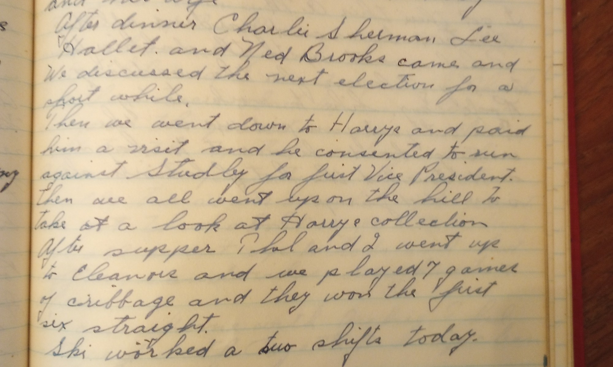 209th day- 156 days follow Went down to see Harry on the Point. Rode up on the hill with Harry and his wife. After dinner Charlie Sherman, Lee Hallet, and Ned Brooks came and we discussed the next election for a short while. Then we went down to Harry’s and paid him a visit and …