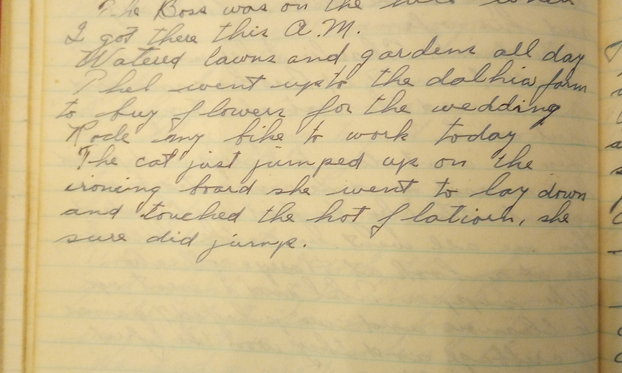 210th day- 155 days follow Fair and warm. The boss was on the hill when I got there this A.M. Watered lawns and gardens all day. Thel went up to the dahlia farm to buy flowers for the wedding. Rode my bike to work today. The cat just jumped up on the ironing board. She …