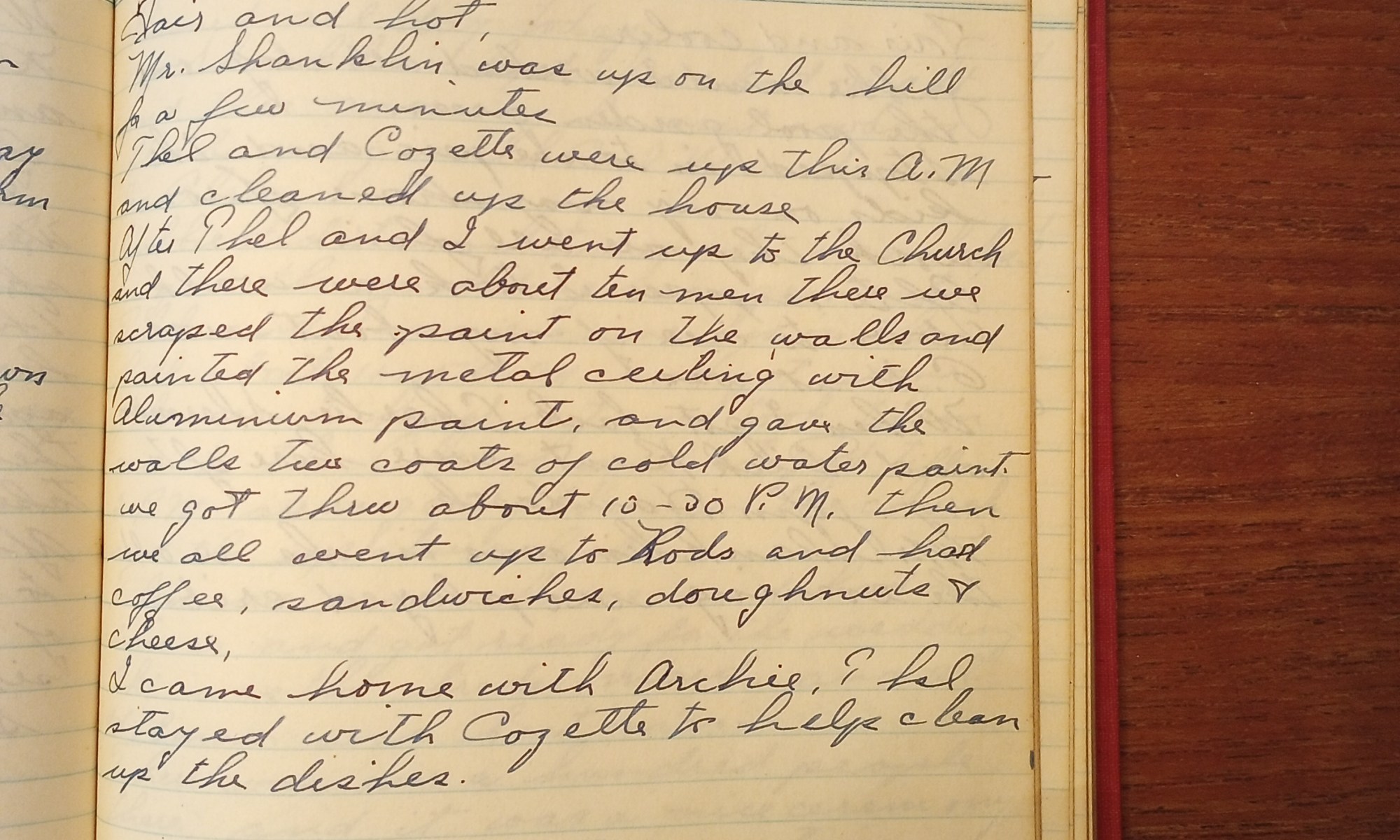 211th day- 154 days follow Fair and hot. Mr. Shanklin was up on the hill for a few minutes. Thel and Cozette were up this A.M. and cleaned up the house. After Thel and I went up to the church and there were about ten men there. We scraped the paint on the walls and …