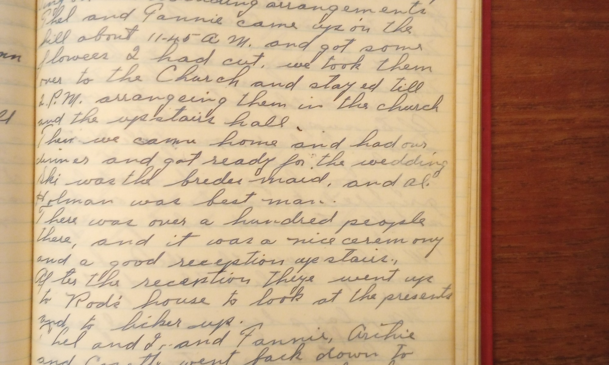 213th day- 152 days follow Rained all day today. Mr. Shanklin slept here last night and this morning he went swamp blueberrying with Carl Rounds and Geo. Olsson. Jubbie didn’t work today. He was helping on the wedding arrangements. Thel and Fannie came up on the hill about 11:45 A.M. and got some flowers I …
