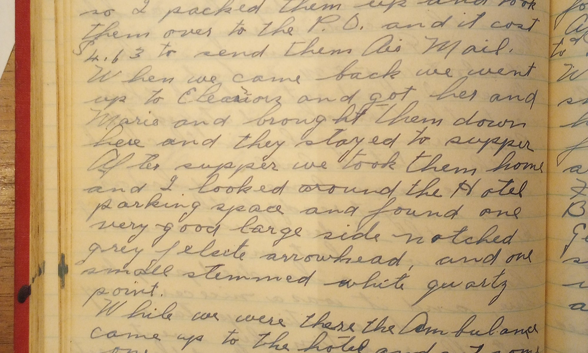214th day- 151 days follow (Arrowheads) Rained all day today. Jubbie and I didn’t work today. Thel and I went up on the hill and got some sweaters that Mrs. H. wanted out west so I packed them up and took them over to the P.O. and it cost $4.63 to send them Air Mail. …