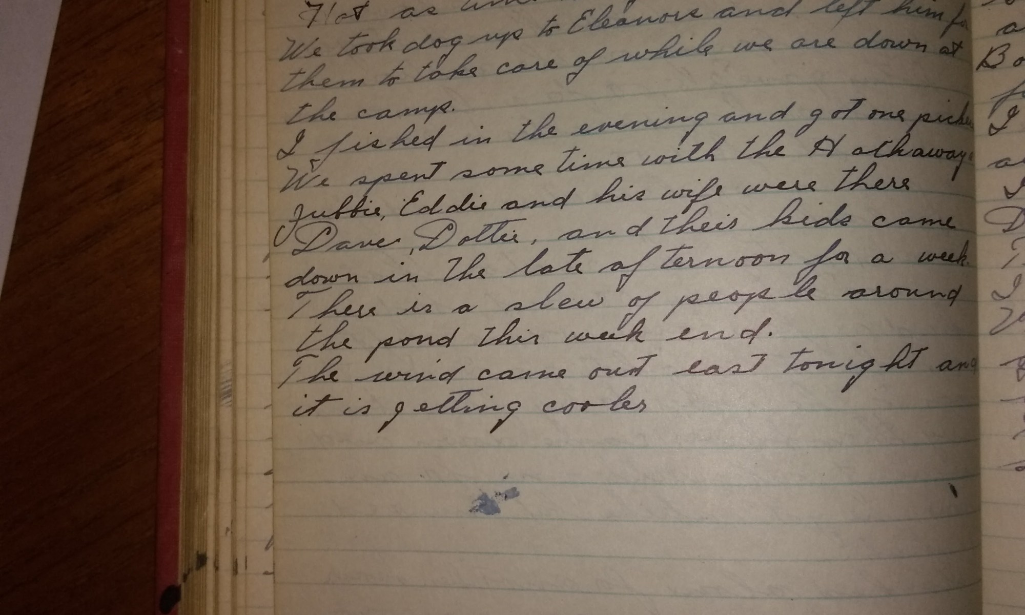 188th day- 177 days follow Hot as time today. We took the dog up to Eleanor’s and left him for them to take care of while we are down at the camp. I fished in the evening and got one pickerel. We spent some time with the Hathaway’s. Jubbie, Eddie, and his wife were there. …
