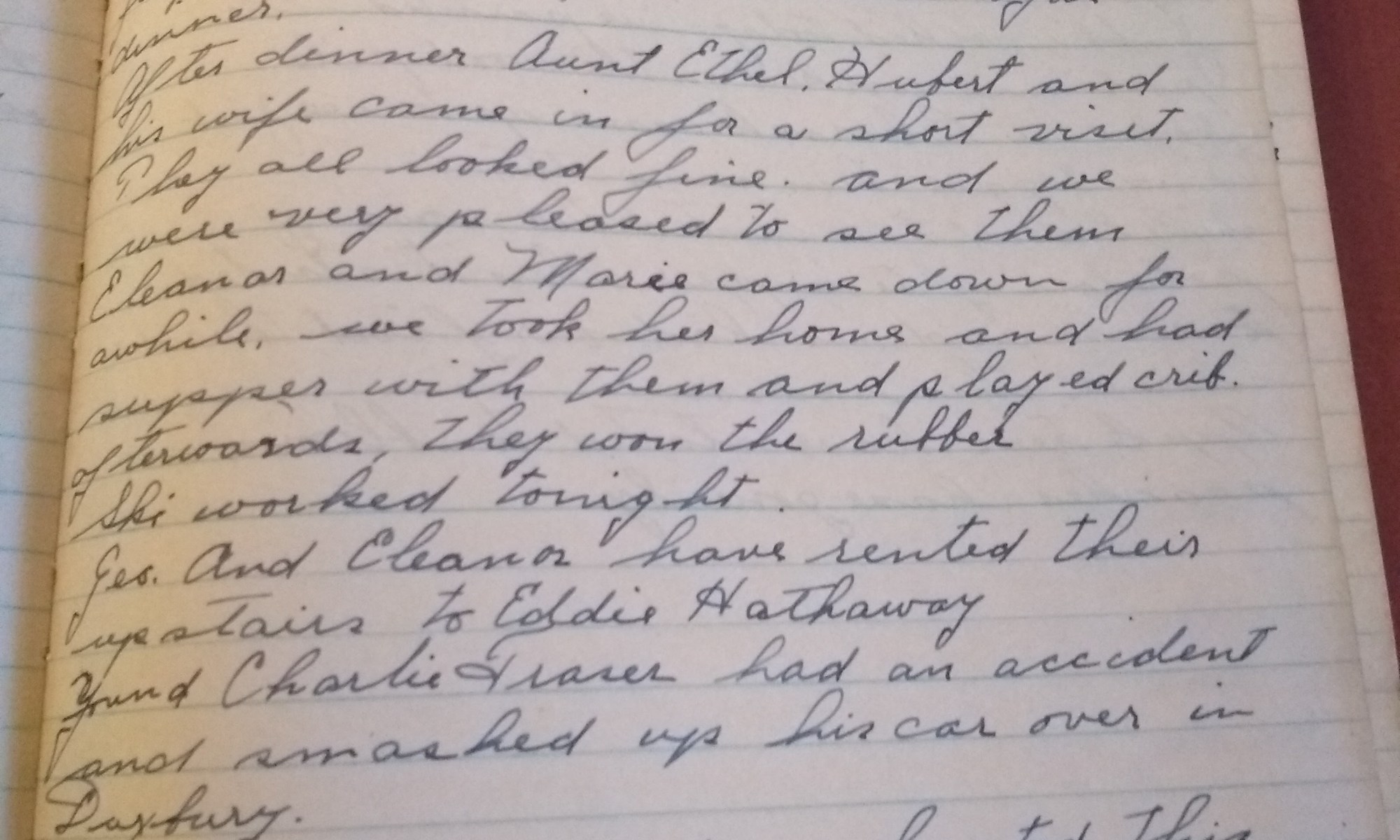 125th day- 240 days follow Rain and cold all day wind east. We got up late this morning. George was in a few minutes before dinner. After dinner Aunt Ethel, Hubert, and his wife came in for a short visit. They all looked fine, and we were very pleased to see them. Eleanor and Marie …