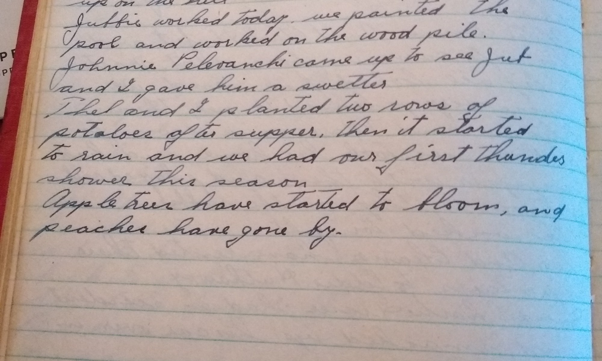 126th day- 239 days follow Fair and warmer. Wind west. The gang of house cleaners were on the job up on the hill. Jubbie worked today. We painted the pool and worked on the wood pile. Johnnie Palavanchi came up to see Jub and I gave him a sweater. Thel and I planted two rows …