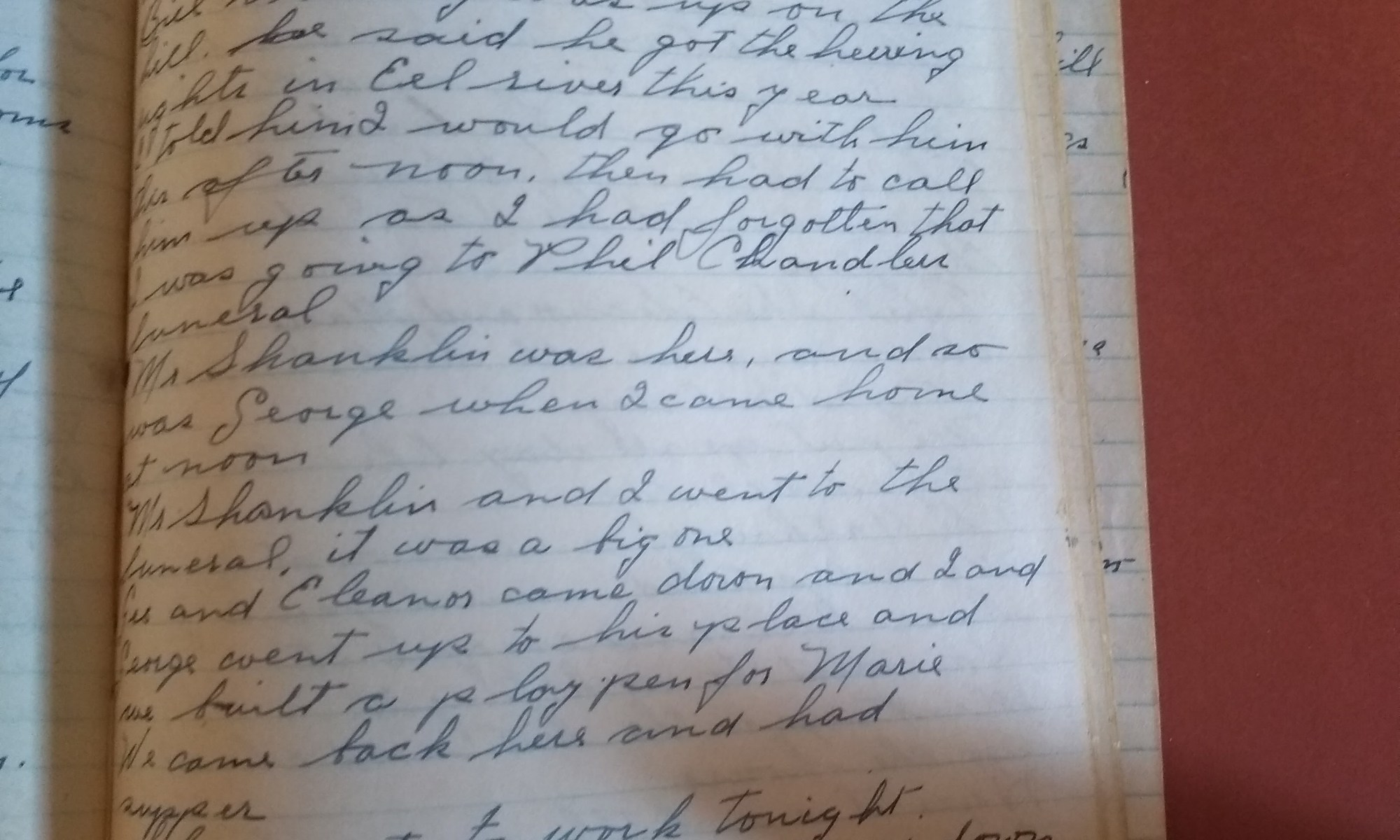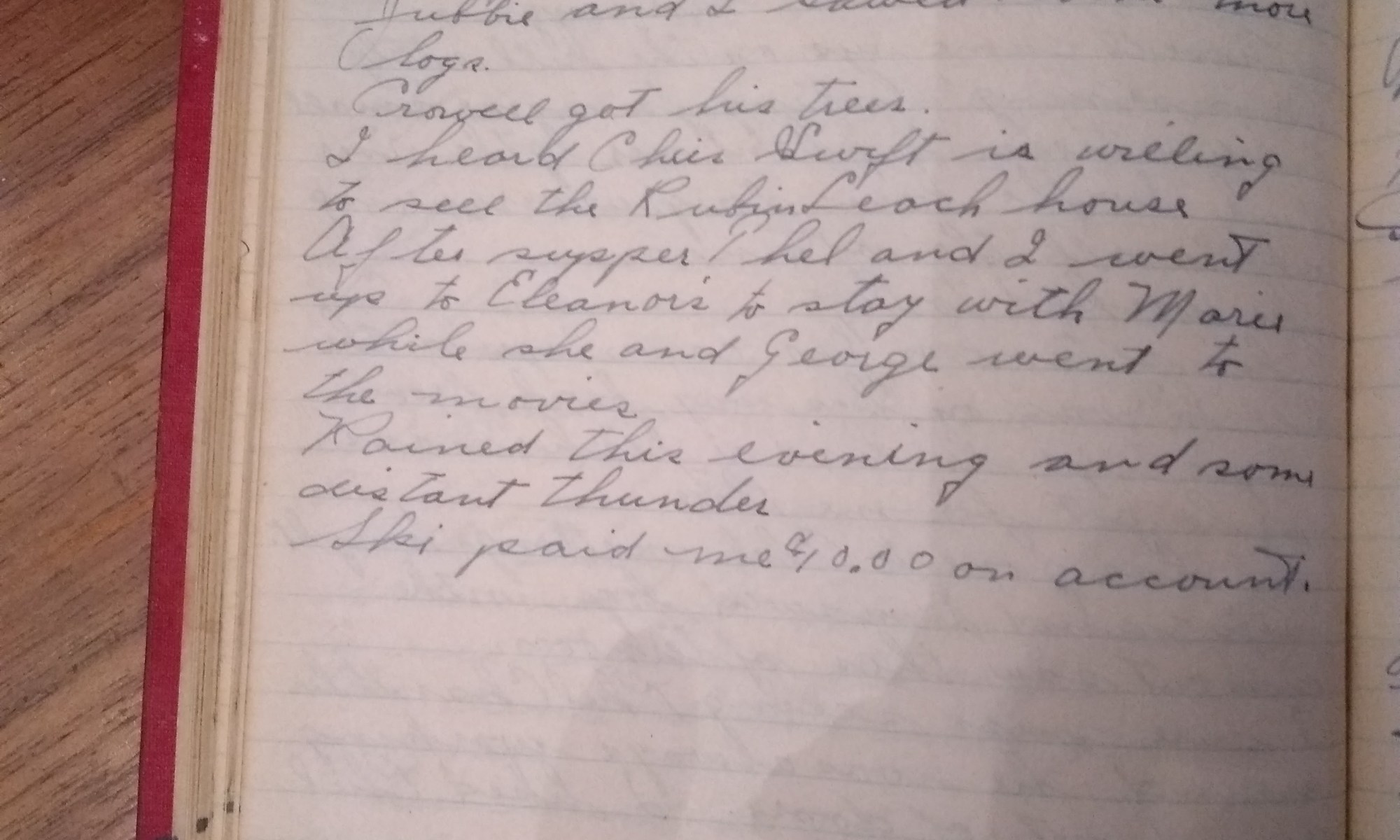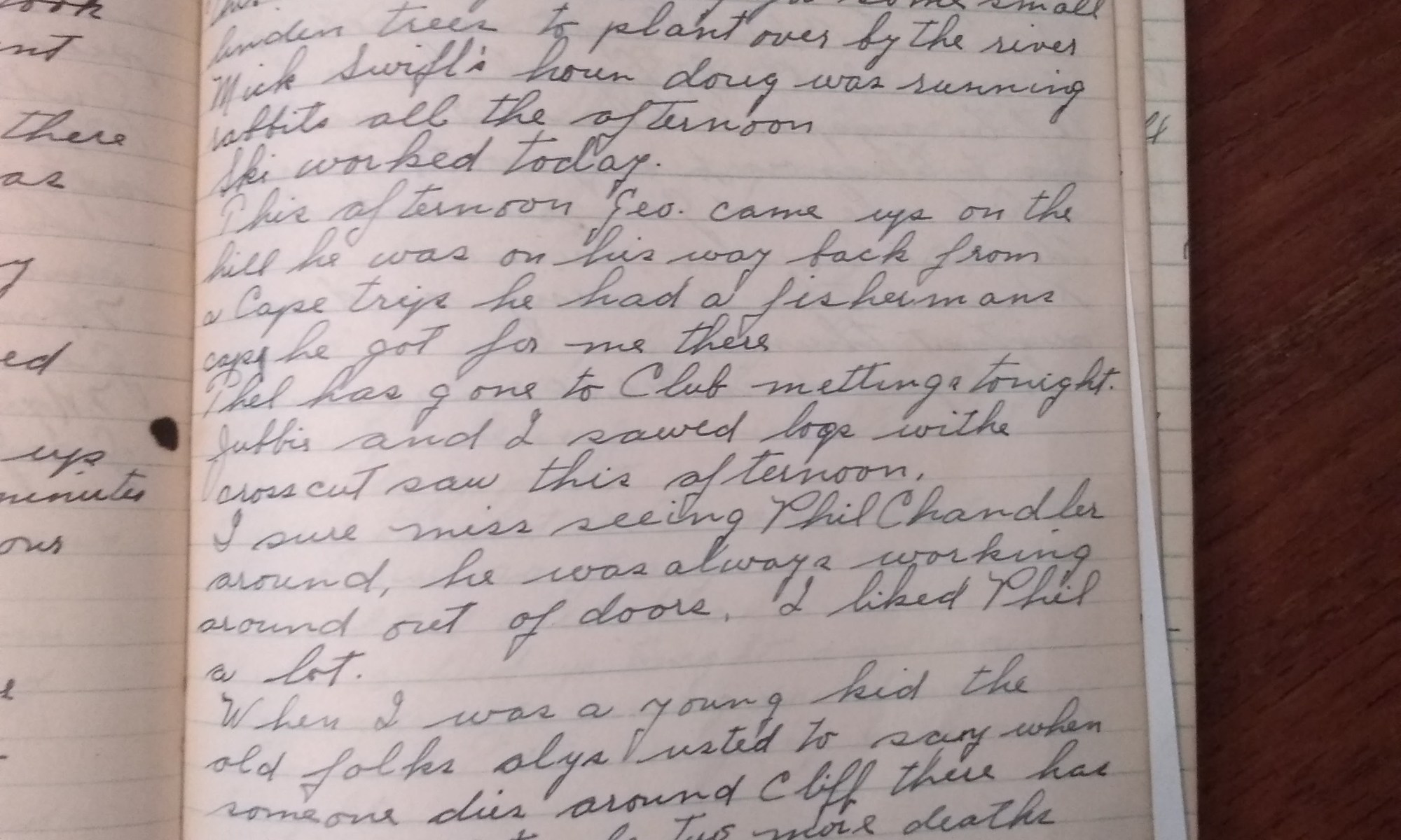 94th day- 271 days follow Cloudy and cold. Wind So. W. Jubbie and I sawed some more logs. Crowell got his trees. I heard Chris Swift is willing to sell the Robin Leach house. After supper Thel and I went up to Eleanor’s to stay with Marie while she and George went to the movies. …