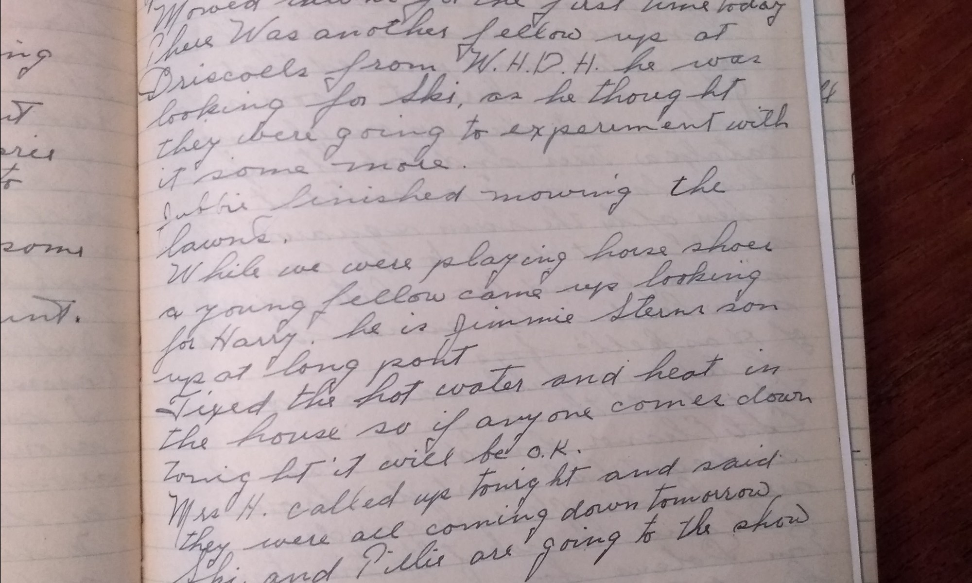 95th day- 270 days follow Fair and cold. Wind north Joe Manter was up this A.M. and plowed the fire belt. Mowed lawns for the first time today. There was another fellow up at Drdiscolls from W.H.D.H. He was looking for Ski, as he thought they were going to experiment with it some more. Jubbie …