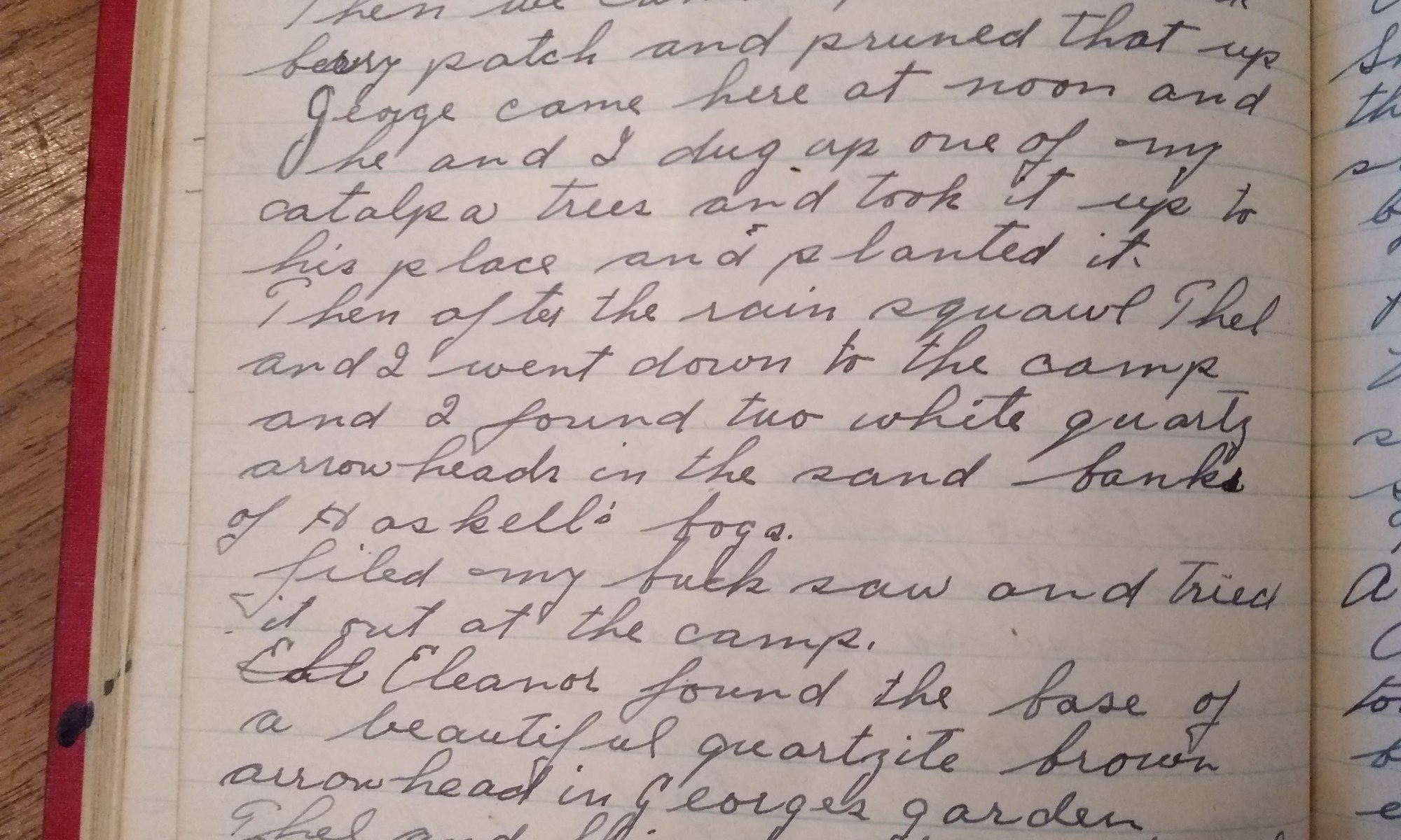 96th day- 269 days follow (Arrowheads) Partly cloudy. One hard shower. Jubbie and I went down to the foot of the drive and grubbed out a lot of rose bush roots. Then we came up to the black berry patch and pruned that up. George came here at noon and he and I dug up …