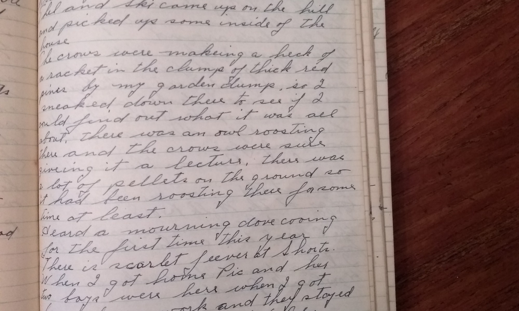 67th day- 298 days follow Cooler and partly cloudy. Raked rubbish all day up around the house. Rode my wheel home to dinner. Thel and Ski came up on the hill and picked up some inside of the house. The crows were making a heck of a racket in the clump of thick red pines …
