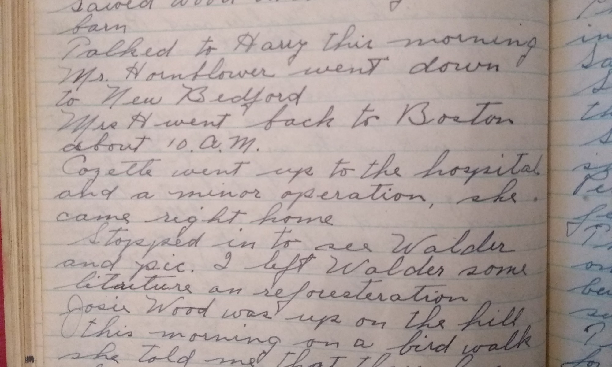 70th day- 295 days follow Fair this forenoon started in to snow at noon. Sawed wood in back of the barn. Talked to Harry this morning. Mr. Hornblower went down to New Bedford. Mrs. H. went back to Boston about 10AM Cozette went up to the hospital and had a minor operation. She came right …