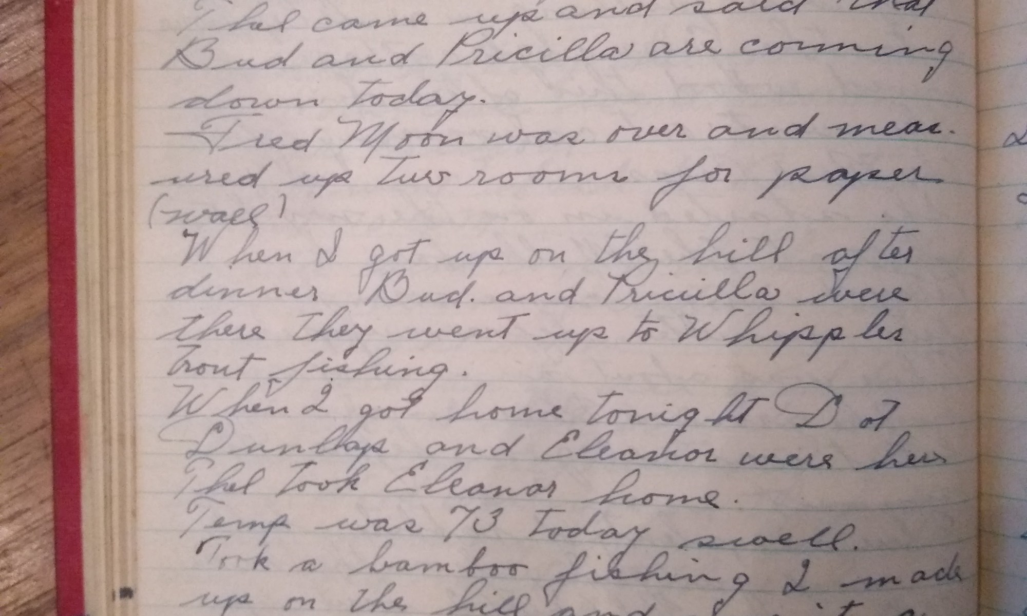 72nd day- 293 days follow Fair and warm, fine day. Worked down in the garden on some sashes for the cold frames. Thel came up and said that Bud and Priscilla are doming down today. Fred Moon was over and measured up two rooms for paper (wall). When I got up on the hill after …