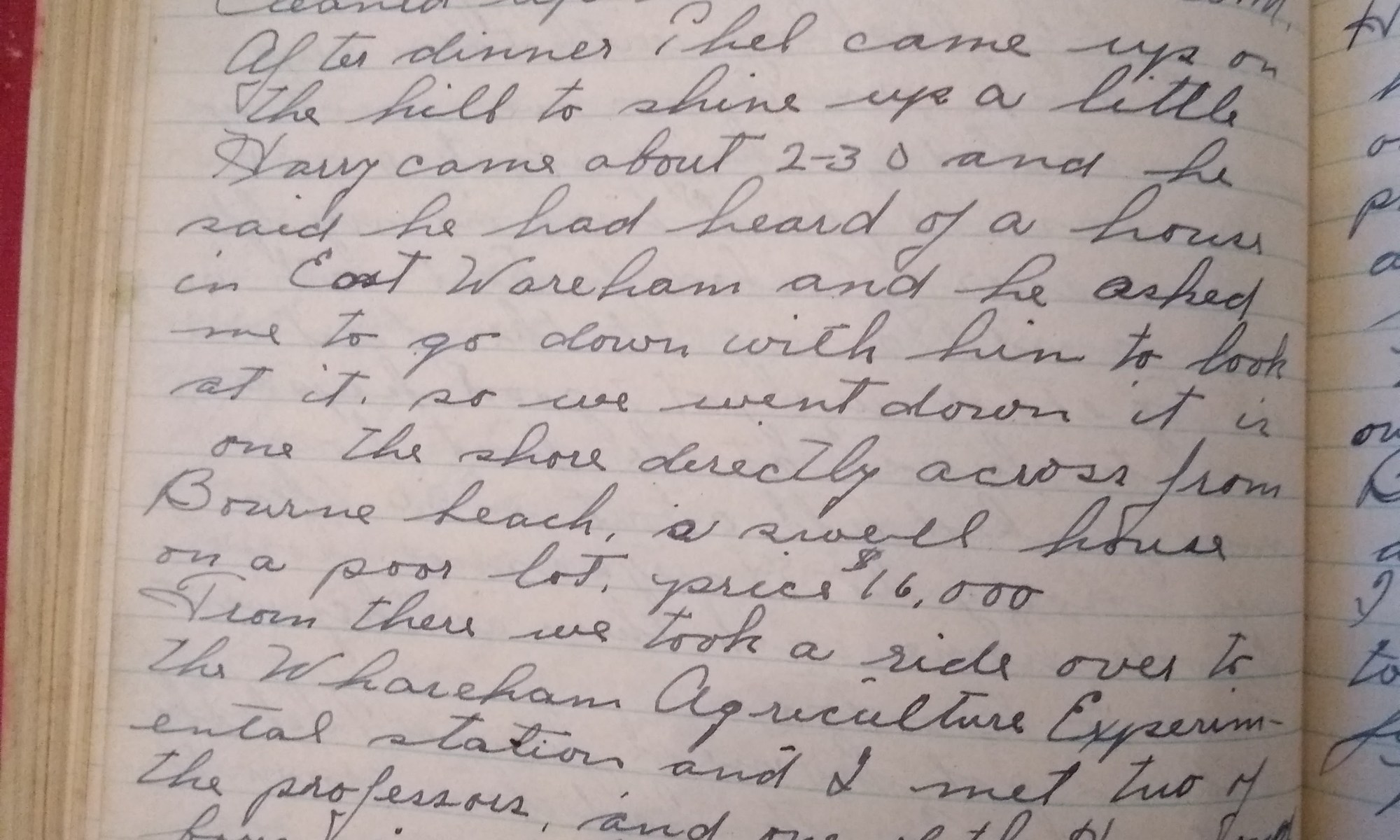 74th day- 291 days follow Cloudy and cooler light shower. Cleaned up the house this A.M. After dinner Thel came up on the hill to shine up a little (?) Harry came about 2:30 and he said he had heard of a house in East Wareham and he asked me to go down with him …