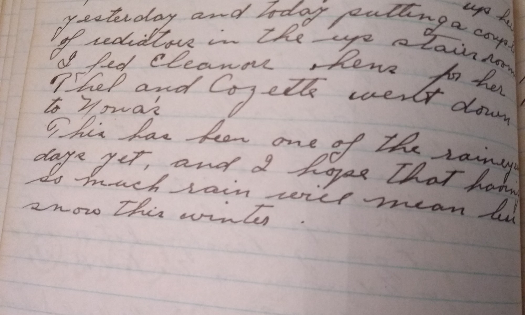 340th day- 25 days follow Warmer and No. East rain storm Went up on the hill this A.M. and did some chores. There has been a plumber up here yesterday and today putting a couple of radiators in the up stairs rooms. I fed Eleanors hens for her. Thel and Cozette went down to Nona’s. …
