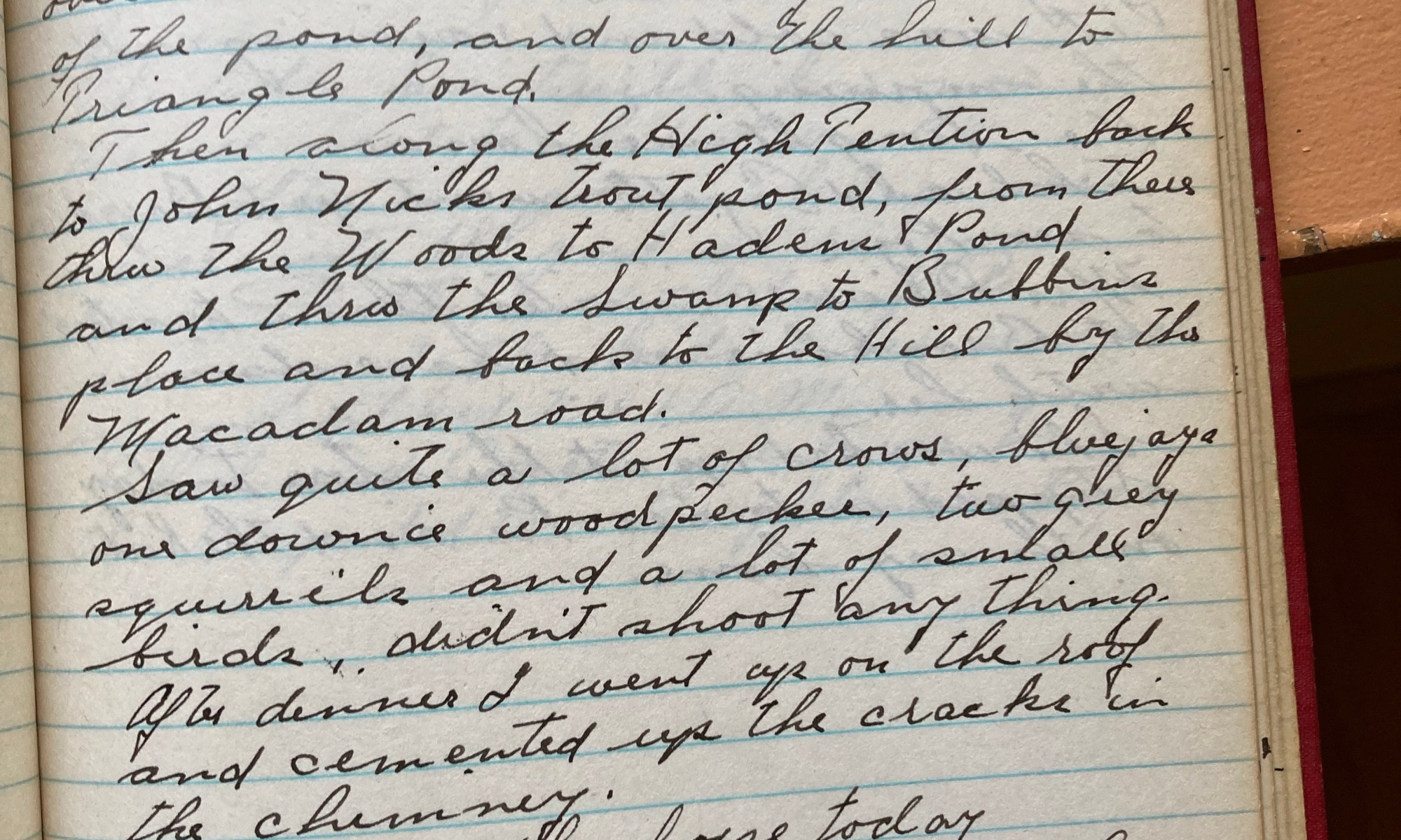 323rd day - 42 days to follow Fair and warm for the season. Went up on the hill and got my gun and went up thru Ward’s Pasture by the County Farm and up the So Pond Road as far as the Town Forest, then over to Cooks Pond along the shore of the pond …