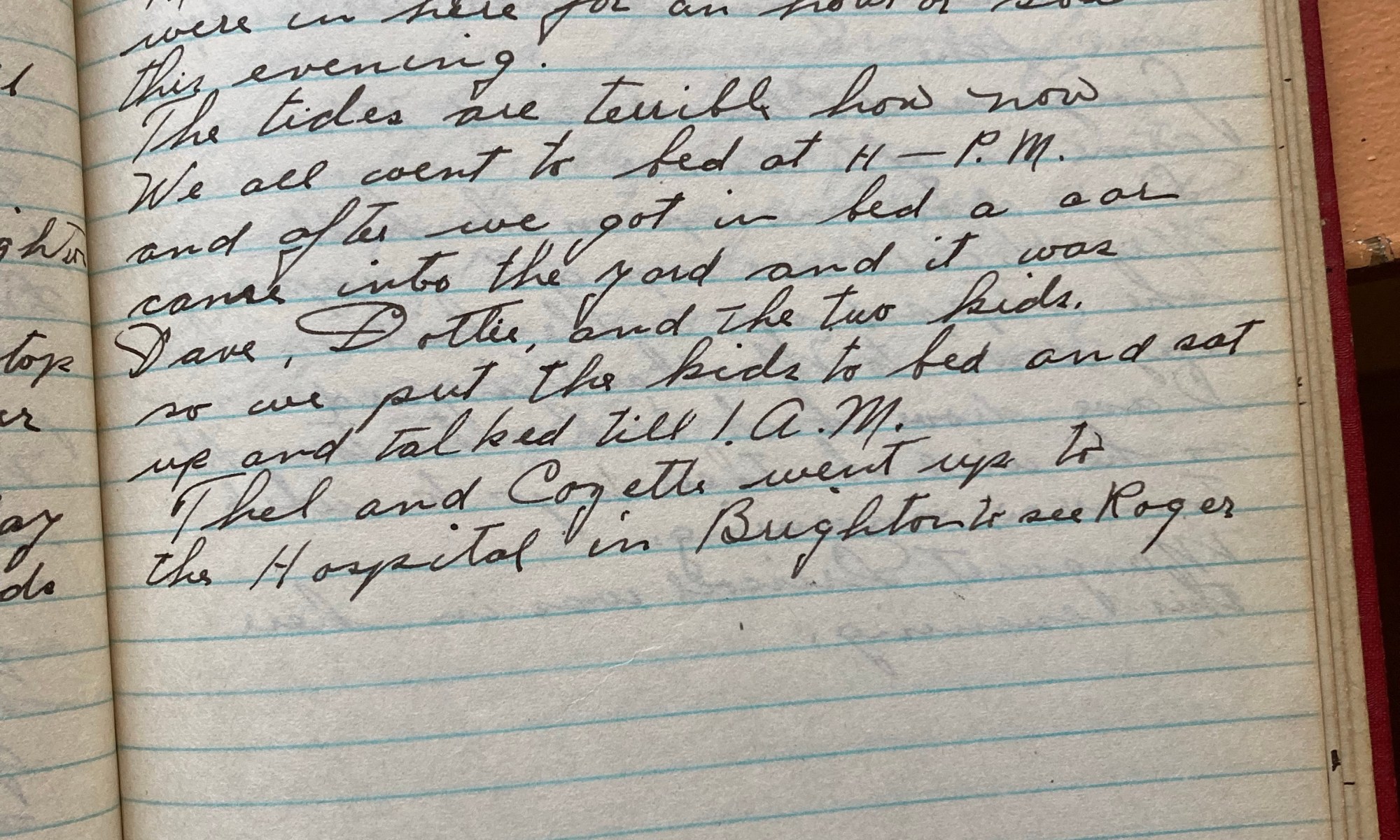 325th day - 40 days to follow Fair and cool. Jubbie and I worked on the drive all day. Fred Moon worked today. Mrs Finney, Helen, and Marian were in here for an hour or so this evening. The tides are terrible high now. We all went to jbed at 11-PM. And after we got …
