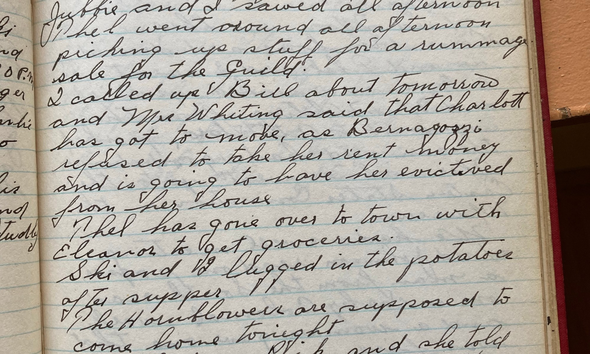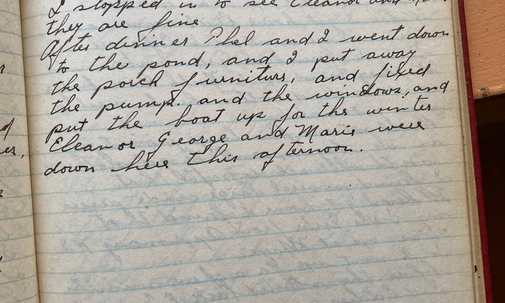 313th day - 52 days to follow Fair and warm, fine day. Fred Moon and Jubbie worked all day. Put in the whole morning getting the house ready for the folks. Jubbie and I sawed all afternoon. Thel went around all afternoon picking up stuff for a rummage sale for the Guild. I called up …