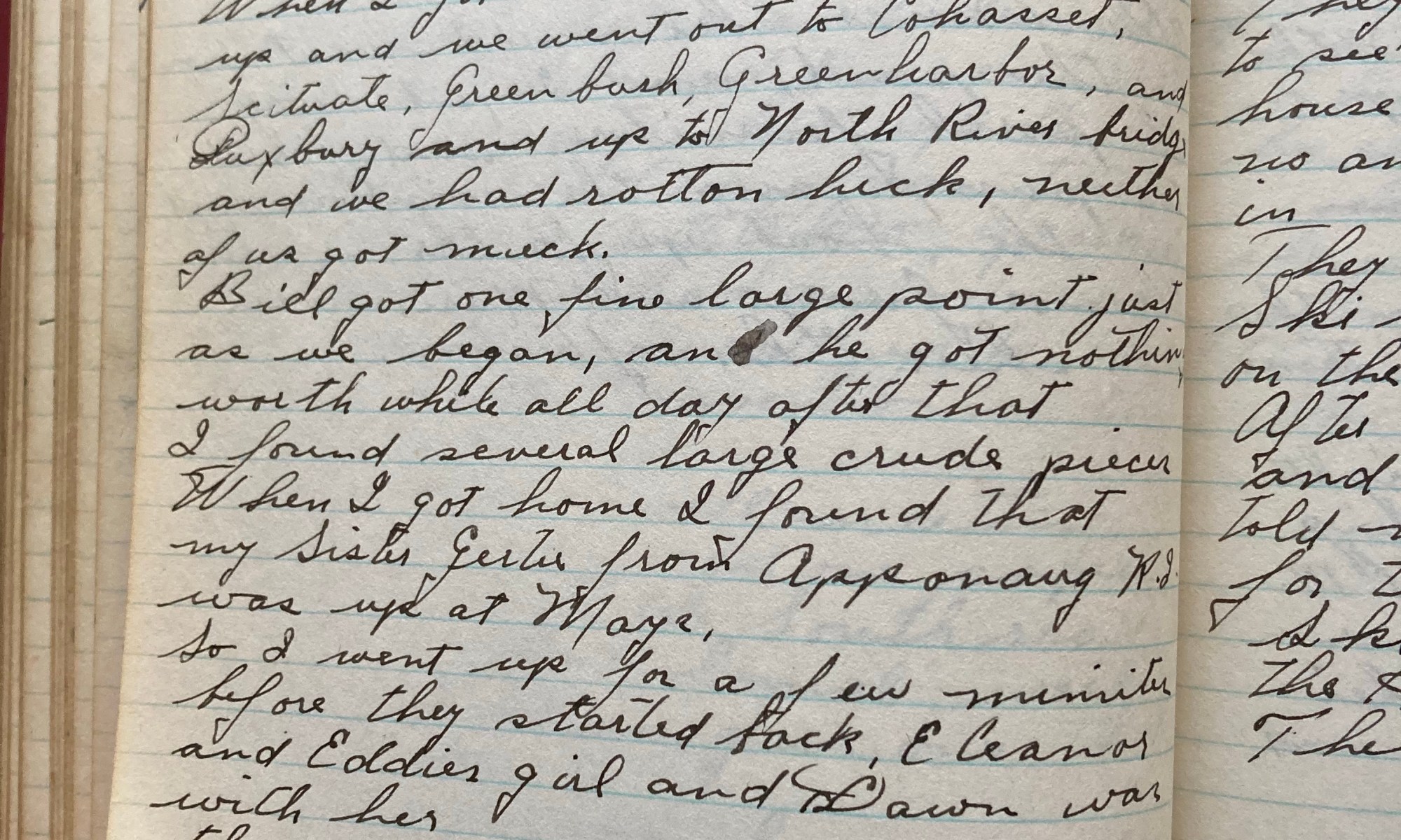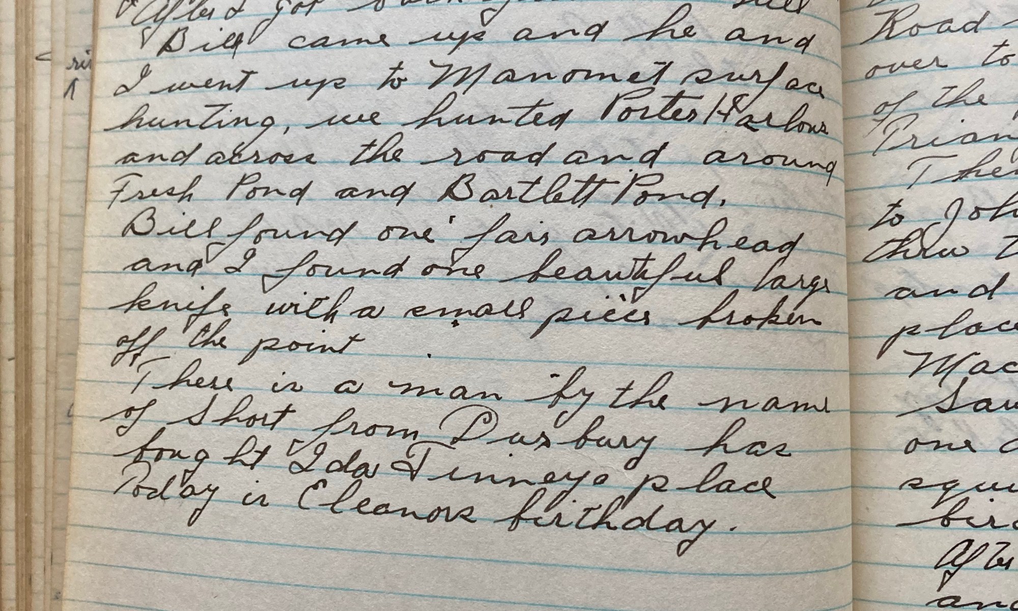 322nd day - 43 days to follow Fair to partly cloudy, warm. Went up on the hill this am and saw Mr and Mrs H. George and Junior were here this AM. After I get back from the hill. Bill came up and he and I went up to Manomet surface hunting we hunted Porter …