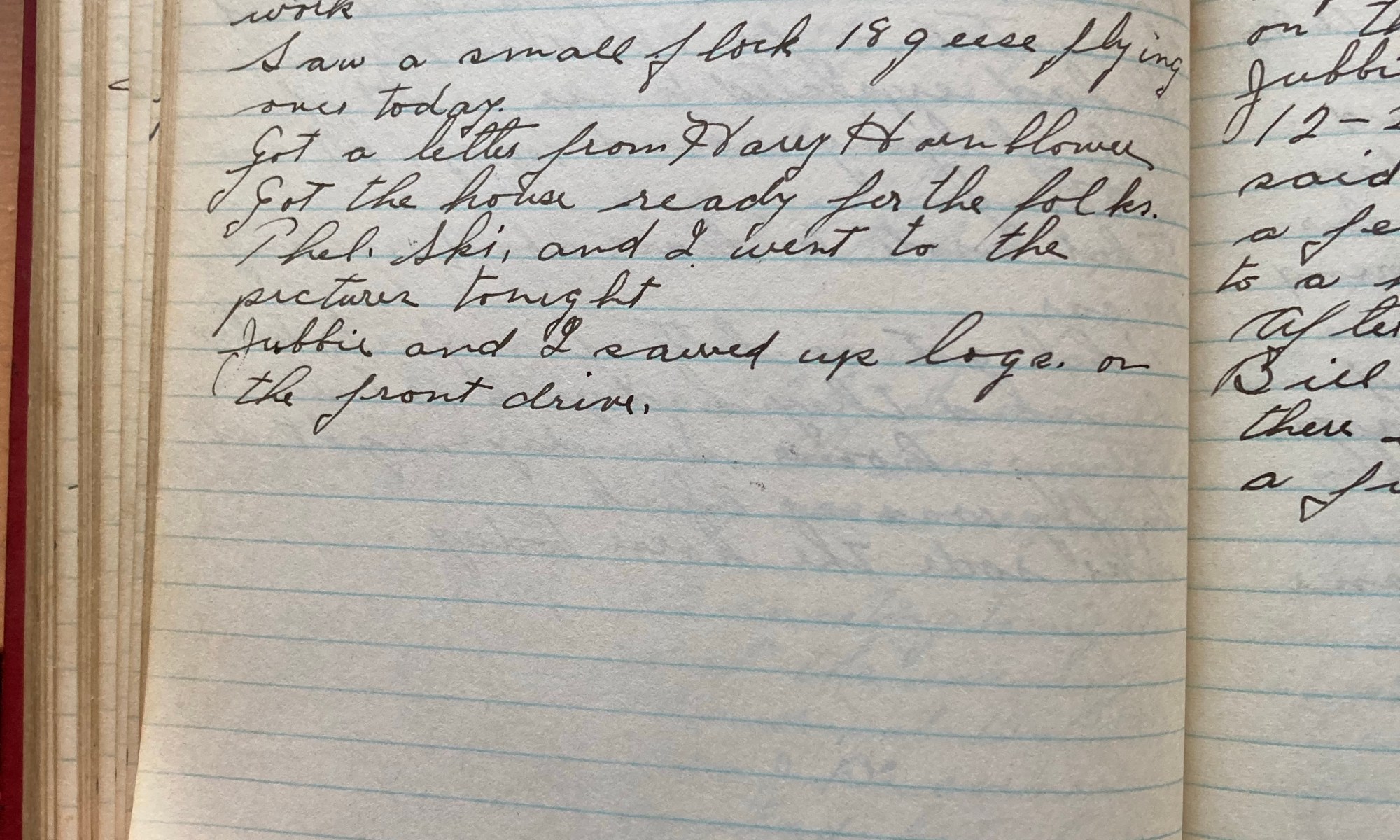 320th day - 45 days to follow Geese Fair and cold wind north. Jubbie worked this afternoon. Fred Moon was up but did not work. Saw a small flock of 18 geese flying once today. Got a letter from Harry Hornblower. Got the house ready for the folks. THel, Ski, and I went to the …