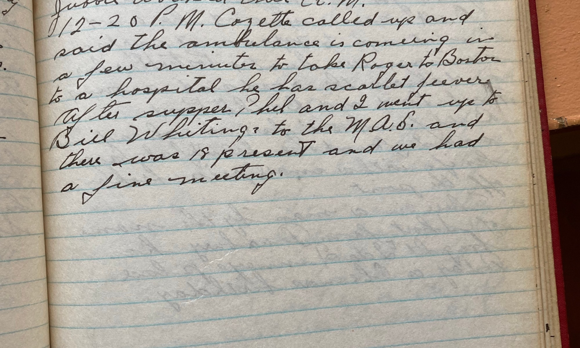 321st day - 44 days to follow Cloudy and cool. Mr and Mrs H were up on the hill, they said that Bud expects to be on the way home soon. Jubbie worked this AM. 12-20 PM Cozette called up and said the ambulance is coming in a few minutes to take Roger to Boston …