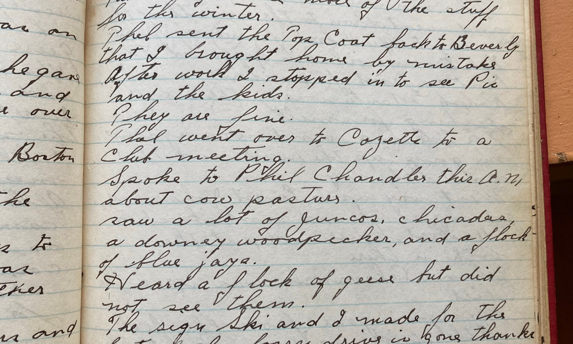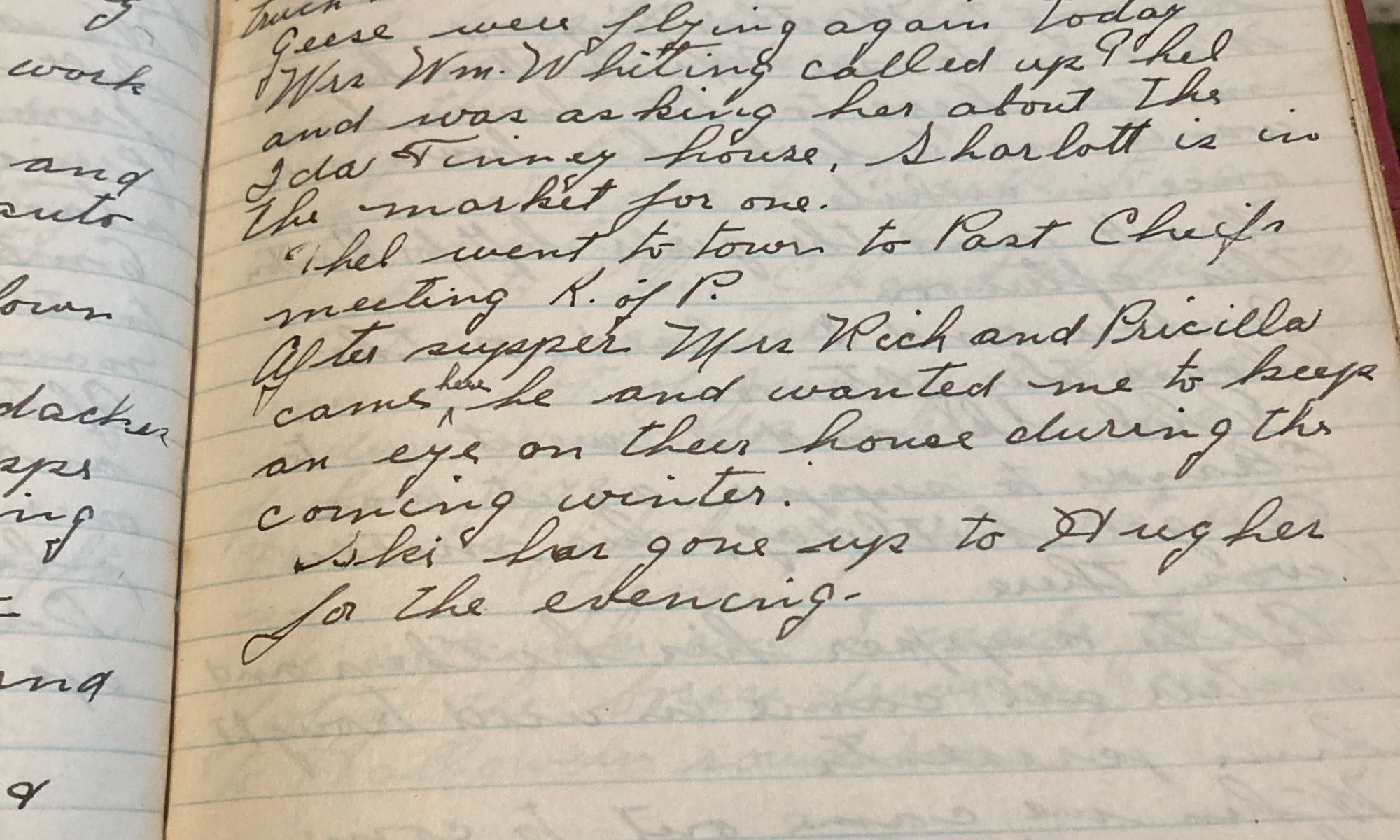 303rd day - 62 days to follow Geese Fair and mild, fine day. The tree fellows worked today, so did Fred Moon, and Jubbie. Mrs H had me running around in circles getting stuff ready for Finneys truck to take to Boston. Geese were flying again today. Mrs Wm Whiting called up Thel and was …