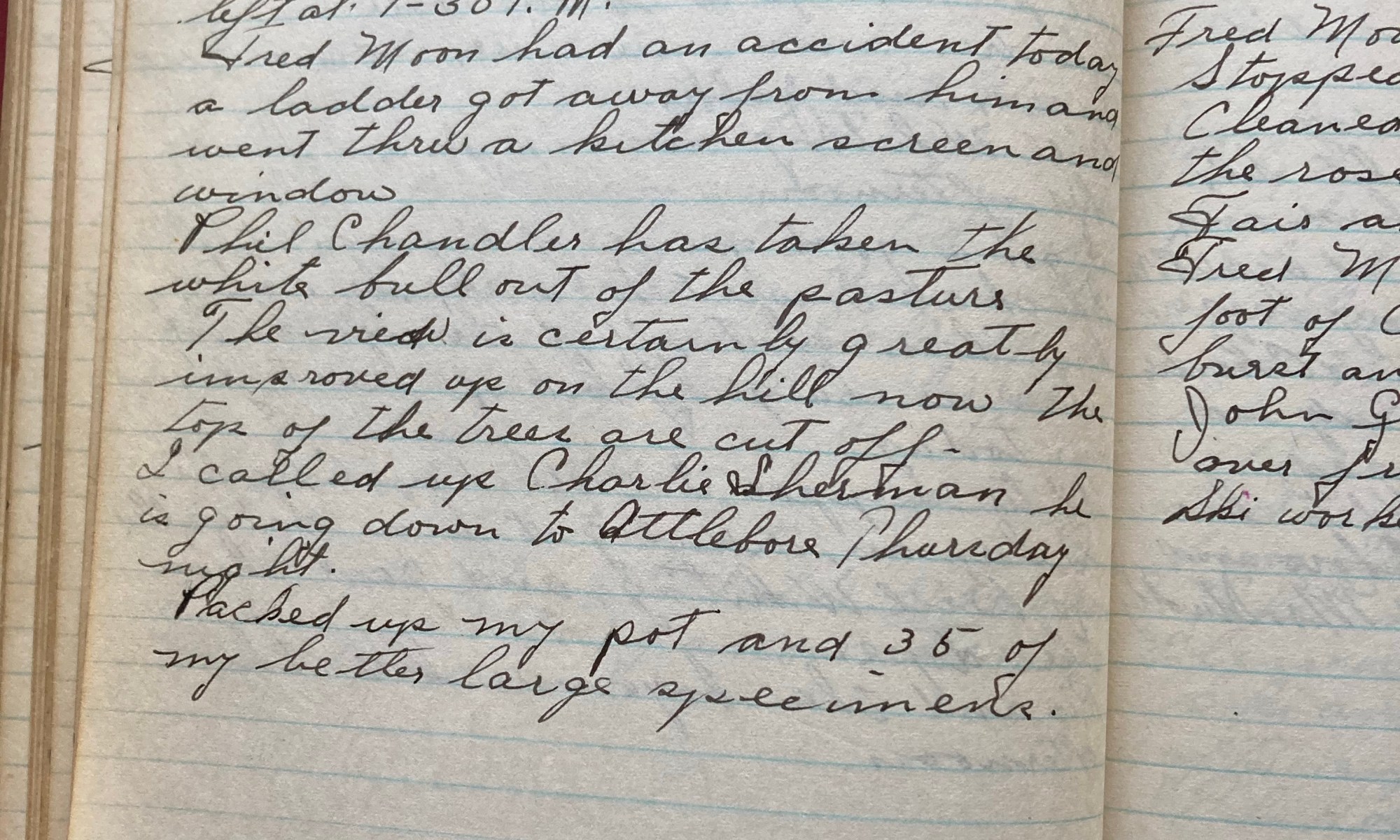 310th day - 55 days to follow Fair and warmer, fine day. Fred Moon, Jubbie, and the tree men worked today. The tree men left at 1-30 PM Fred Moon had an accident today, a ladder got away from him and he went thru a kitchen screen and window. Phil Chandler has taken the white …