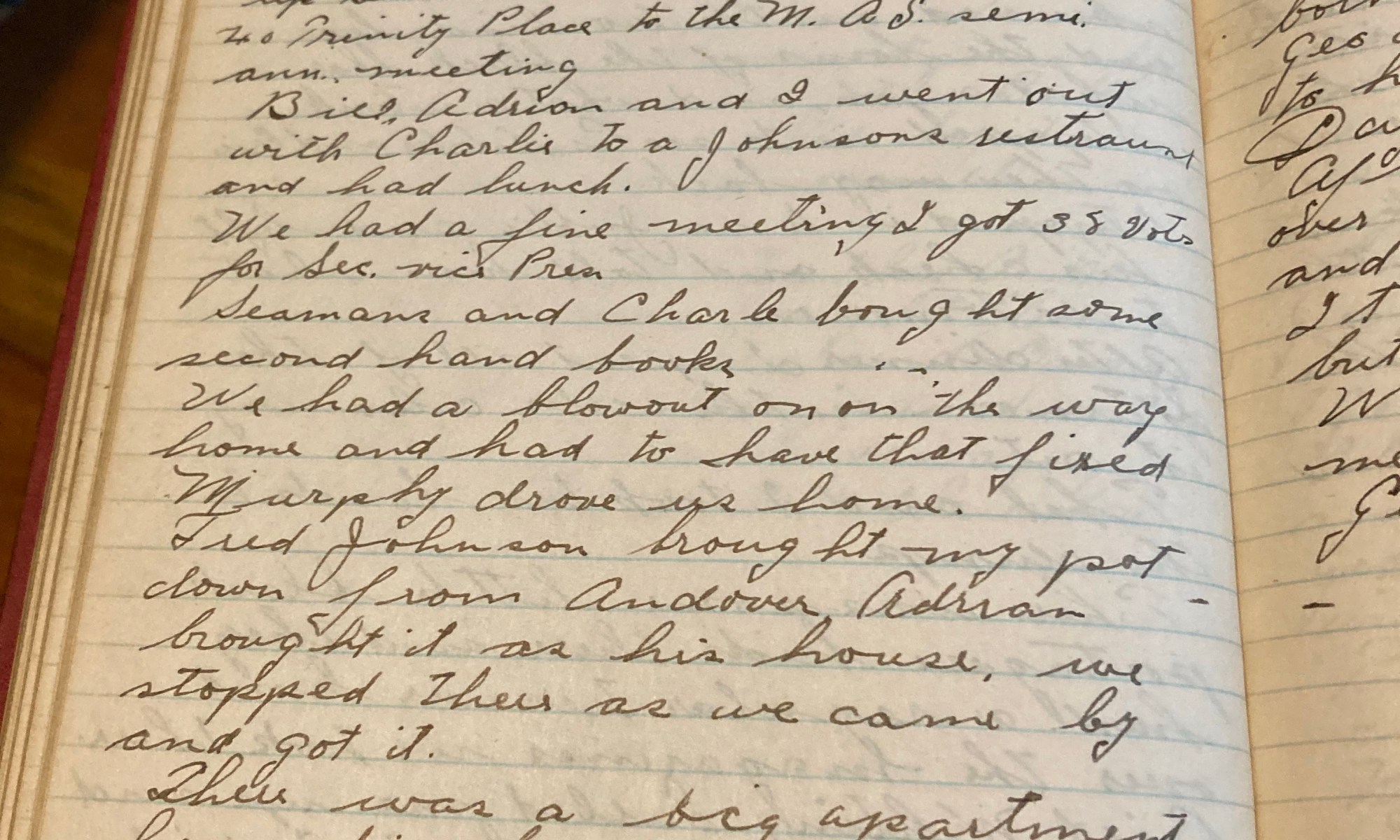 286th day - 79 days to follow MAS Meeting Fair and cool. Bill came up this Am about 8 we went to WHitman and picked up Seamus and he drove up to 40 Trinity Place to the MAS semi ann meeting. Bill, Adrian and I went out with Charlie to a Johnson restaurant and had …