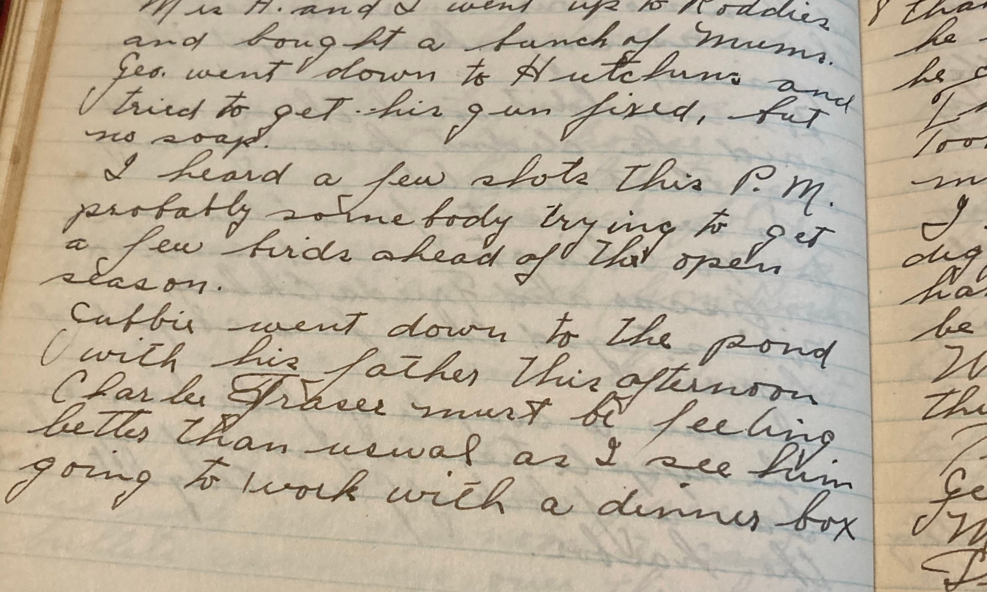 289th day - 76 days to follow Shut off water. Geese. First real sign of fall today, saw a small flock of 13 wild geese flying over the hill at 4 PM. Jubbie worked today. The cook said Mrs H called up and said they took Hank to a hospital and he may have to …