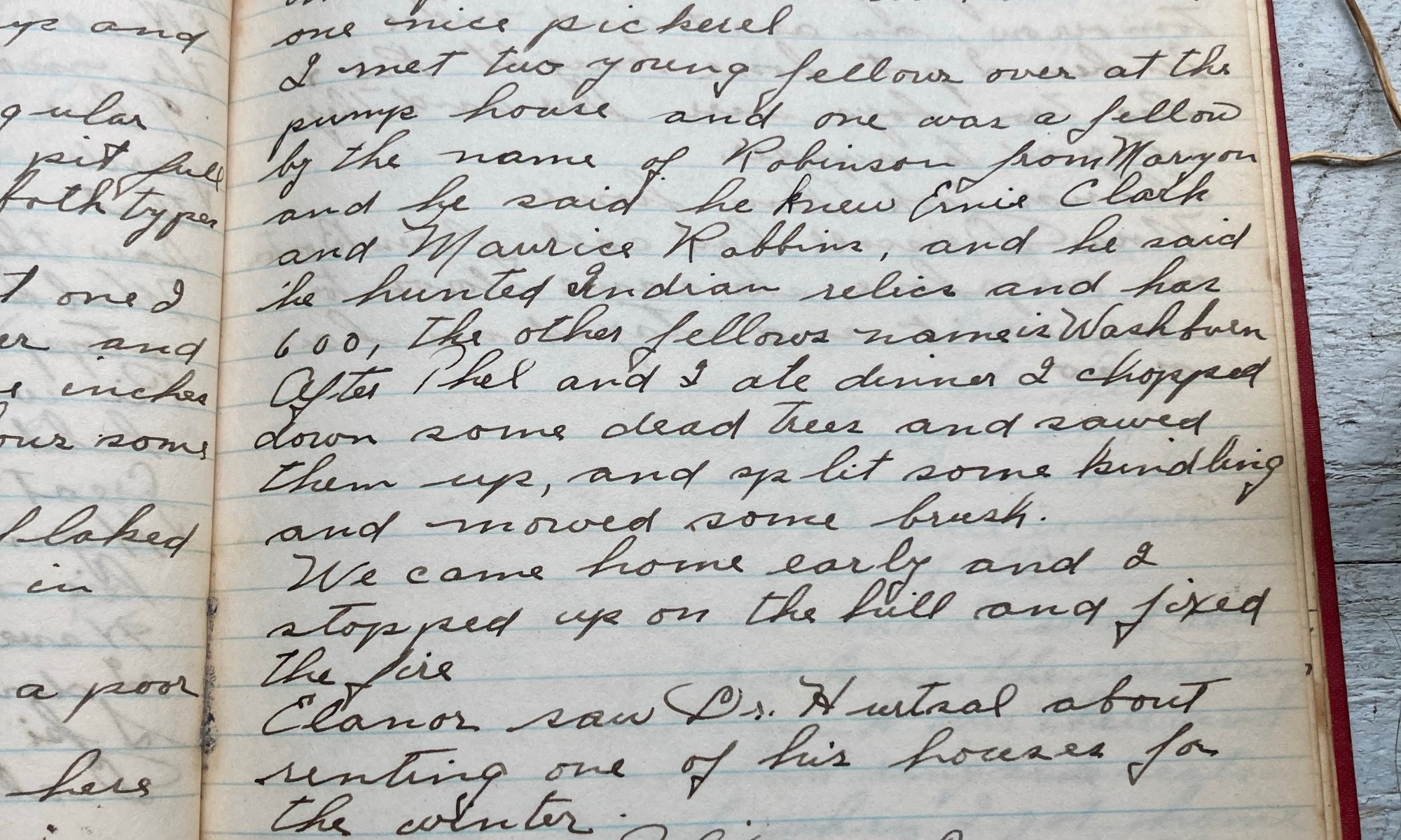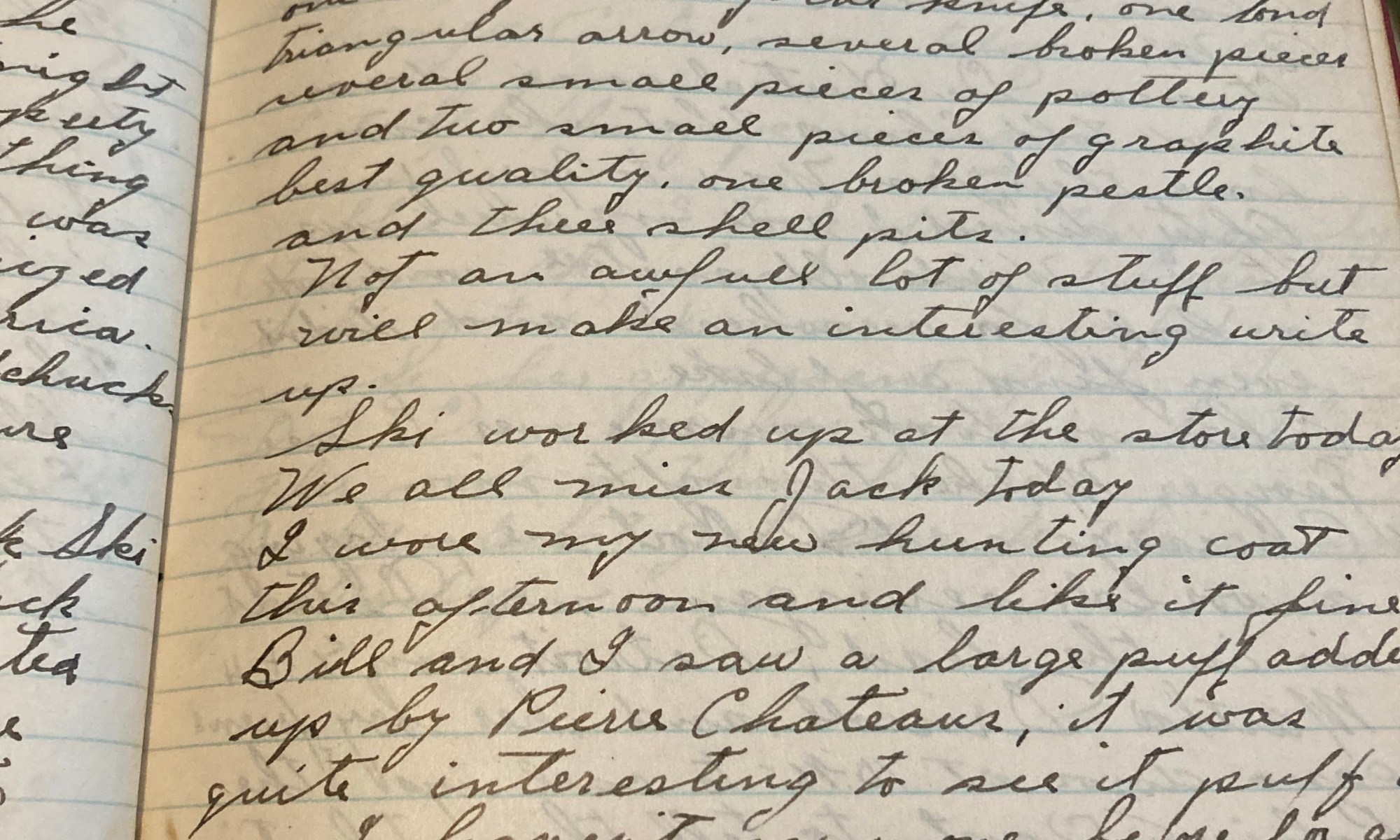 279th day - 86 days to follow Mild and cloudy look like rain. Saw Mr H and Geo Crowell this AM. After dinner Bill came up and we went over to the dig and cleaned up one section. Found one fine stemmed arrowhead, one large triangular knife, one long triangular arrow, several broken pieces, several …