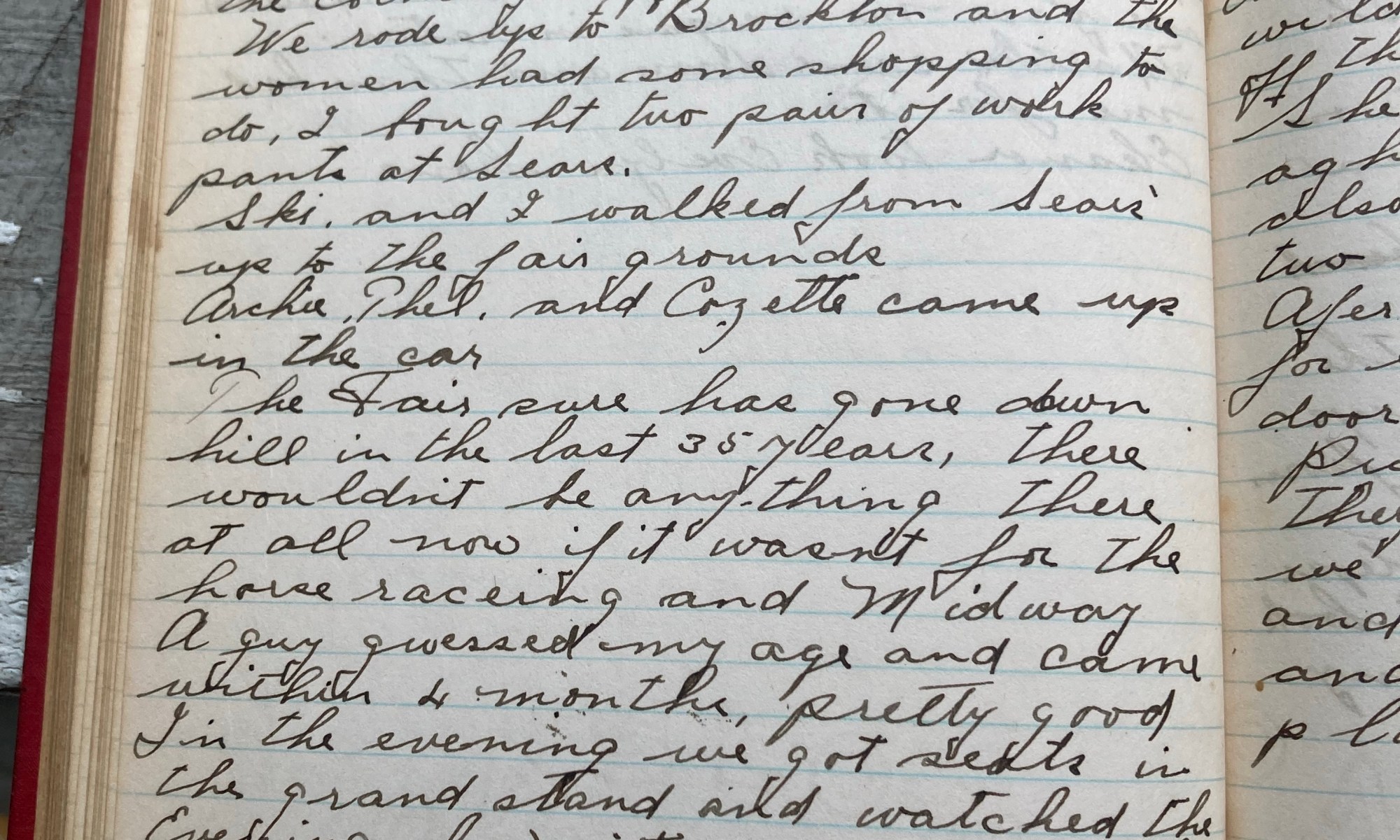 256th day - 109 days to follow Fair and warm wonderful day. Went up on the hill and fixed the fire, then came back and Thel, Ski and I started for Brockton Fair. We picked up Archie and Cozette on the corner of Cliff St. We rode up to Brockton and the women had some …