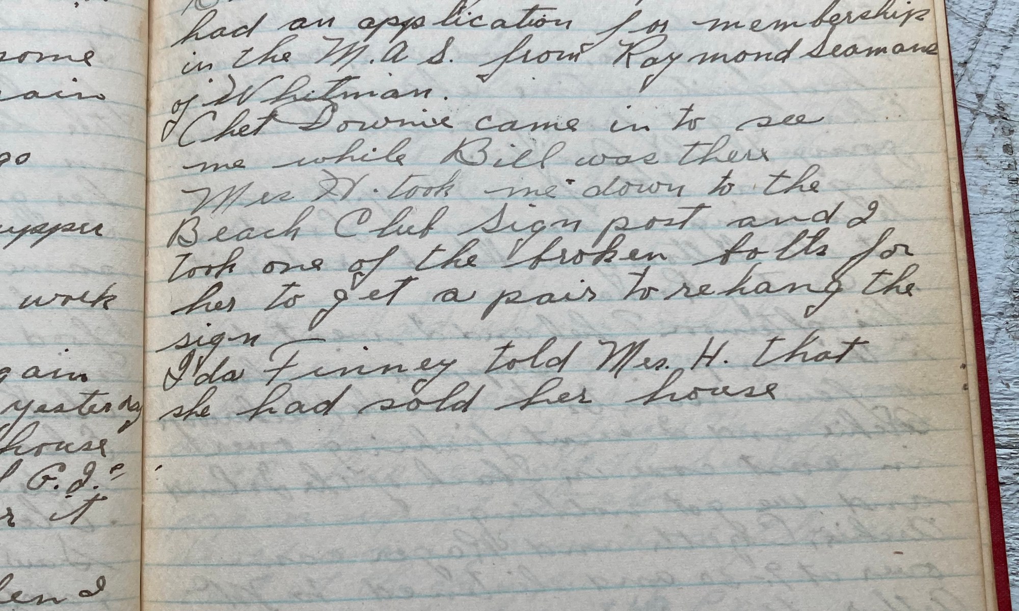 244th day - 121 days to follow Peace Pact signed by Japan and the Allies Sept 1 Fair today thought it was foggy this forenoon. Raked and mowed lawns, also walked down to the Beach Club and carried the sign down, stepladder, two wrenches, two long bolts, screwdriver, ect, and had quite a time rehanging …