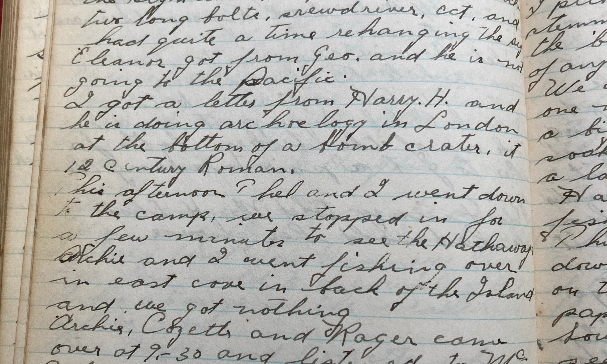 251st day - 114 days to follow Fair and hot. Mrs H went up to the Golf Links and picked mushrooms. After dinner Thel and I went down to the camp. We were just starting in Fishing Walder, Pic, Eric and David came over to the Camp and they stayed till after supper. THel and …